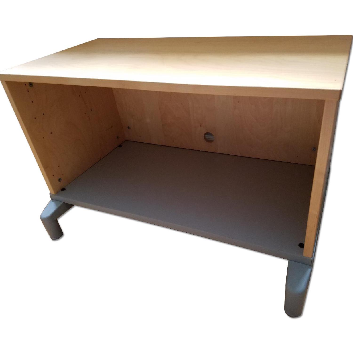 Seller's Notes:Two Effektiv units by IKEA. These consist of two bases with support legs in gray, two add-on units in beech veneer, one file frame, and one file frame front in white. The bases are 33-3/8 x 5-1/2 x 20". The add-on units are 33 x 15-3/4 x 16-1/2" The modular design means that you can have two side by side units, or that you can stack one on the other. These are quite sturdy, and we previously used them side-by-side as an under window storage bench. One of the add-on units has two key-holes drilled into the rear of the panel for electrical cords. We are moving and looking to downsize.