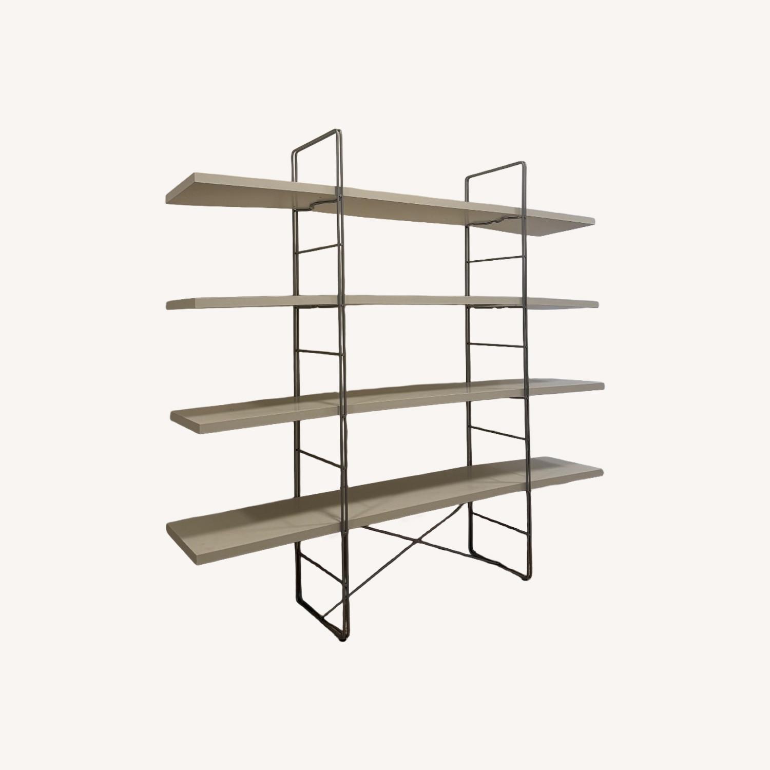 Seller's Notes: The IKEA Enetri shelf is a post-modern shelving unit designed by Niels Gammelgaard, originally released in the 1980s. It features four laminate shelves on a metal ladder frame. In good condition Dimensions: 67Lx12Wx62H