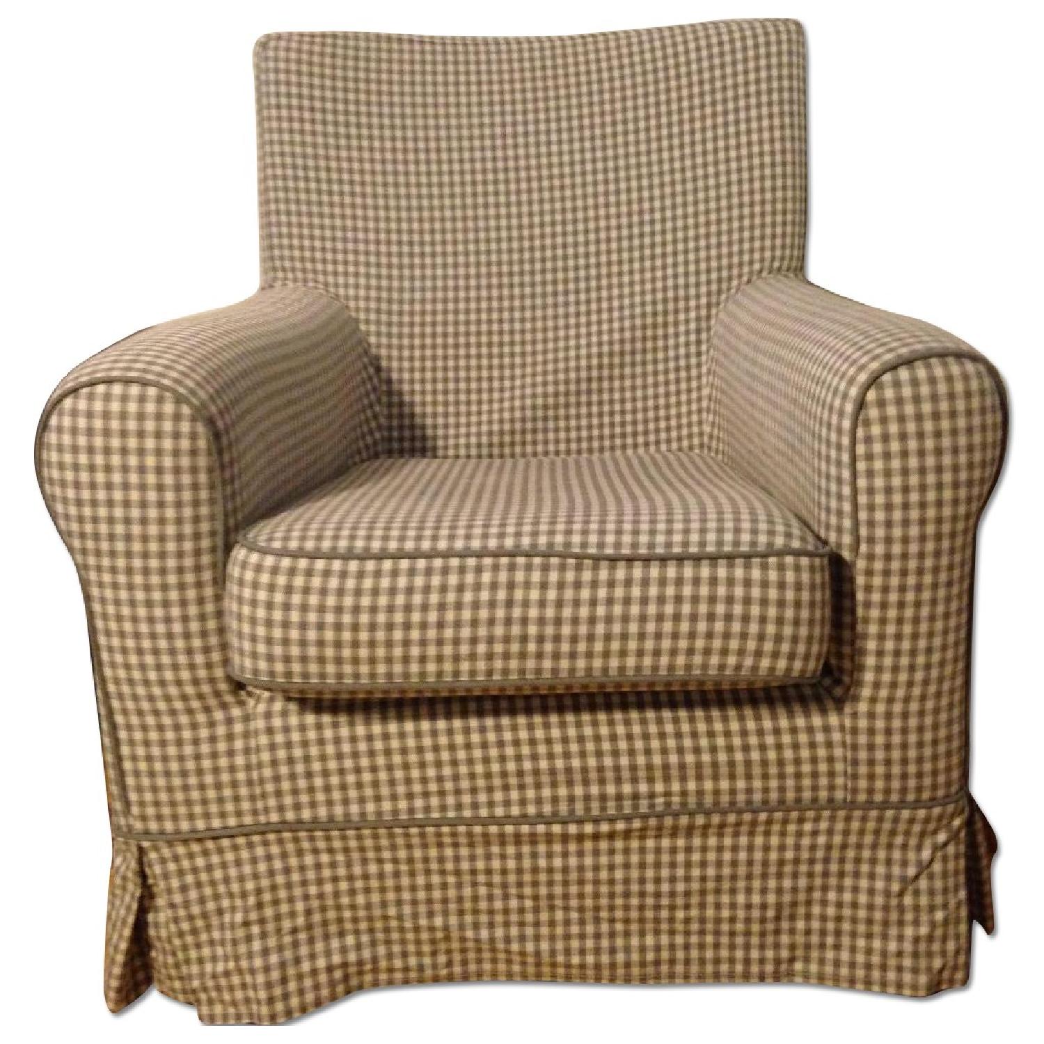 Seller's Notes:IKEA Fabric Covered Arm Chair Ektorp Jennylund] *Comes with black and whit paisley cover as well as grey and white check cover. Or you can purchase your own cover from ikea. Retails for $229 Loved this chair in my living room and bedroom over the last year, and would be great in a kids or babes room. Product dimensions Width: 30 3/4 " Depth: 33 1/2 " Height: 33 1/8 " Seat width: 18 7/8 " Seat depth: 21 5/8 " Seat height: 16 ⅞ " Product description Chair frame: Frame: Particleboard, Fiberboard, Solid wood Leg: Solid beech, Clear acrylic lacquer Back: Polyester wadding, Polyurethane foam 2.2 lb/cu.ft., Polyurethane foam 1.5 lb/cu.ft. Seat cushion: Polyester wadding, Polyurethane foam 2.2 lb/cu.ft. Chair cover: 50 % viscose/rayon, 30 % linen, 20 % polyester