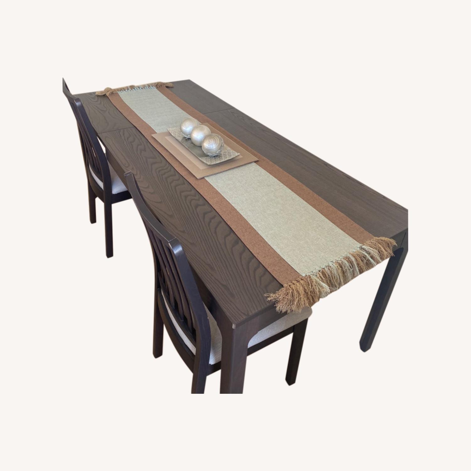 Seller's Notes:Farmhouse table in dark brown with expandable table (71 inches with leaf is inserted, 47 when collapsed. Comes with 1 bench and 2 chairs. Excellent condition, minor scratches