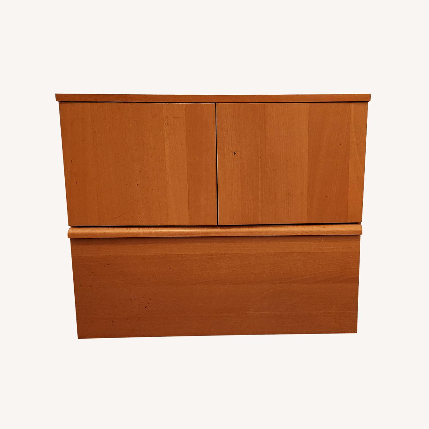 Seller's Notes:This is a terrific combination of one drawer for filing with an upper compartment that includes an extendable tray or platform. There is an opening in the back to allow for cords and cables. I have stored file folders and electronic equipment in it for years, but must now give it up in the move to a smaller apartment. It is in excellent condition, but there is a magic marker stain on the right door, and some minor discolorations of the wood inside. You might want to put plastic feet on the bottom to protect the floor, or add wheels to make it mobile. Note: when the doors are open, the cabinet becomes 34.5" deep, and when the file drawer is fully opened, the unit is 38" deep.