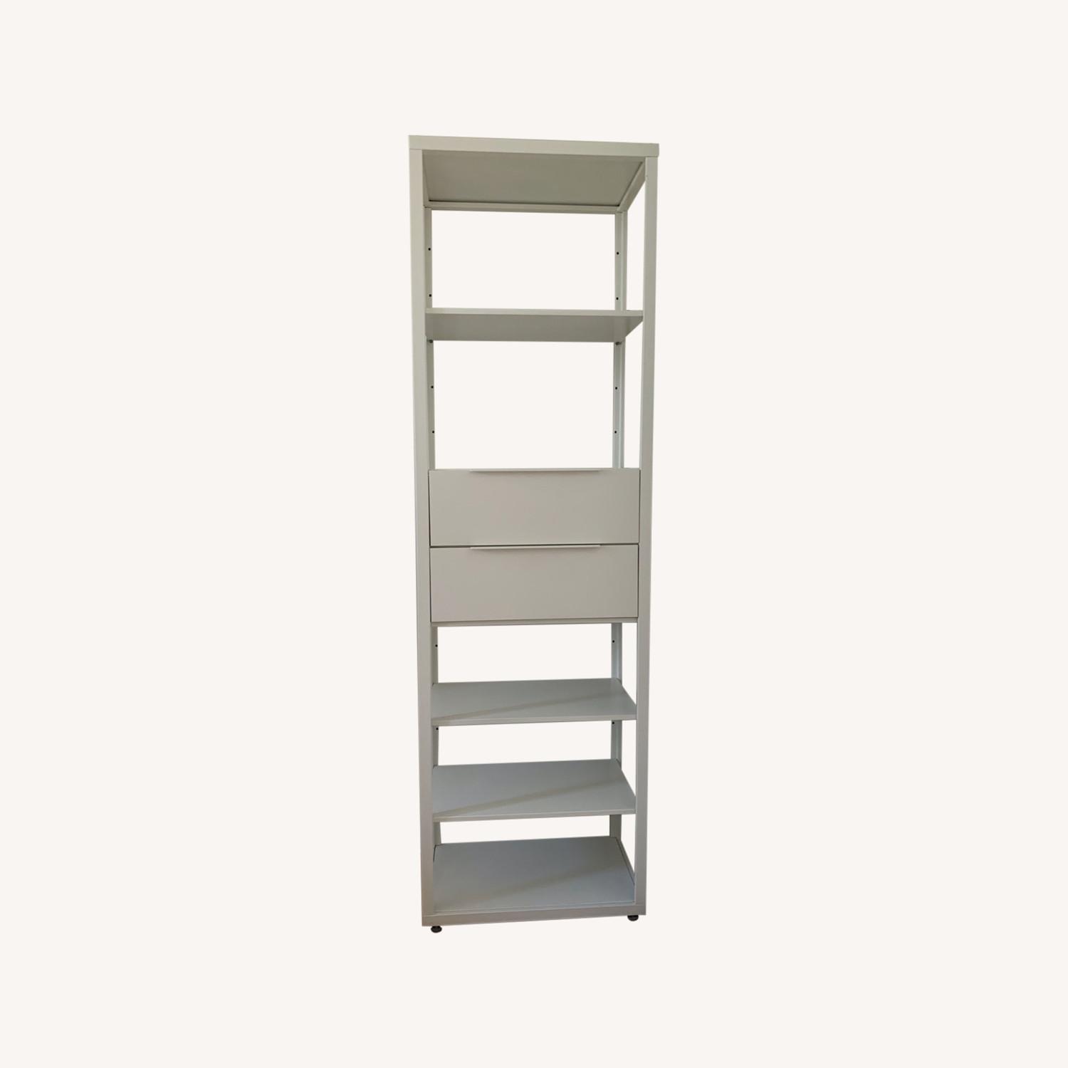 Seller's Notes:IKEA Fjalking shelf unit with two drawers. Narrow shelves in this series (still sold in Europe but not here in the US). Measurement: 23 1/2 wide x 13 3/4 deep x 76 H See the wider item on the Ikea link in this posting. The steel construction is strong but the design feels light and airy with the long slender shelves. Keep your favorite things out in the open and keep those smaller things that often clutter in the smooth, soft closing drawers. You can easily change the height according to your storage needs as the shelves are adjustable. The drawers integrated damper allows it to close slowly, silently and softly.