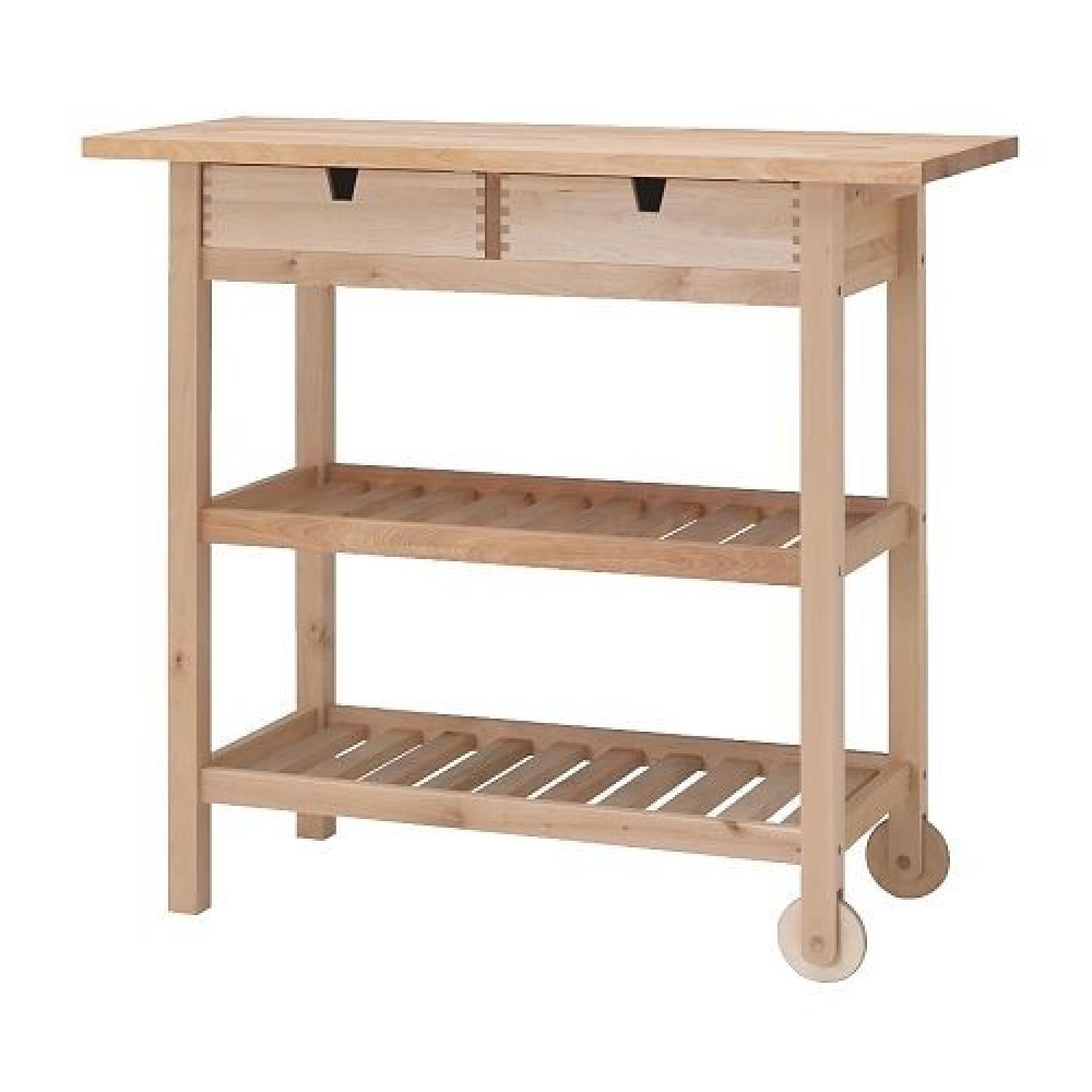 Seller's Notes:IKEA Kitchen Cart in great condition. Excellent for extra kitchen storage and counter space. Has two drawers that can be pulled out from either side and two shelves. Casters make it easy to move around. There are a few water stains on the surface (see pics). I honestly love this cart; it's been very convenient to have in tiny NYC kitchens, but I'm clearing out room in a storage unit.