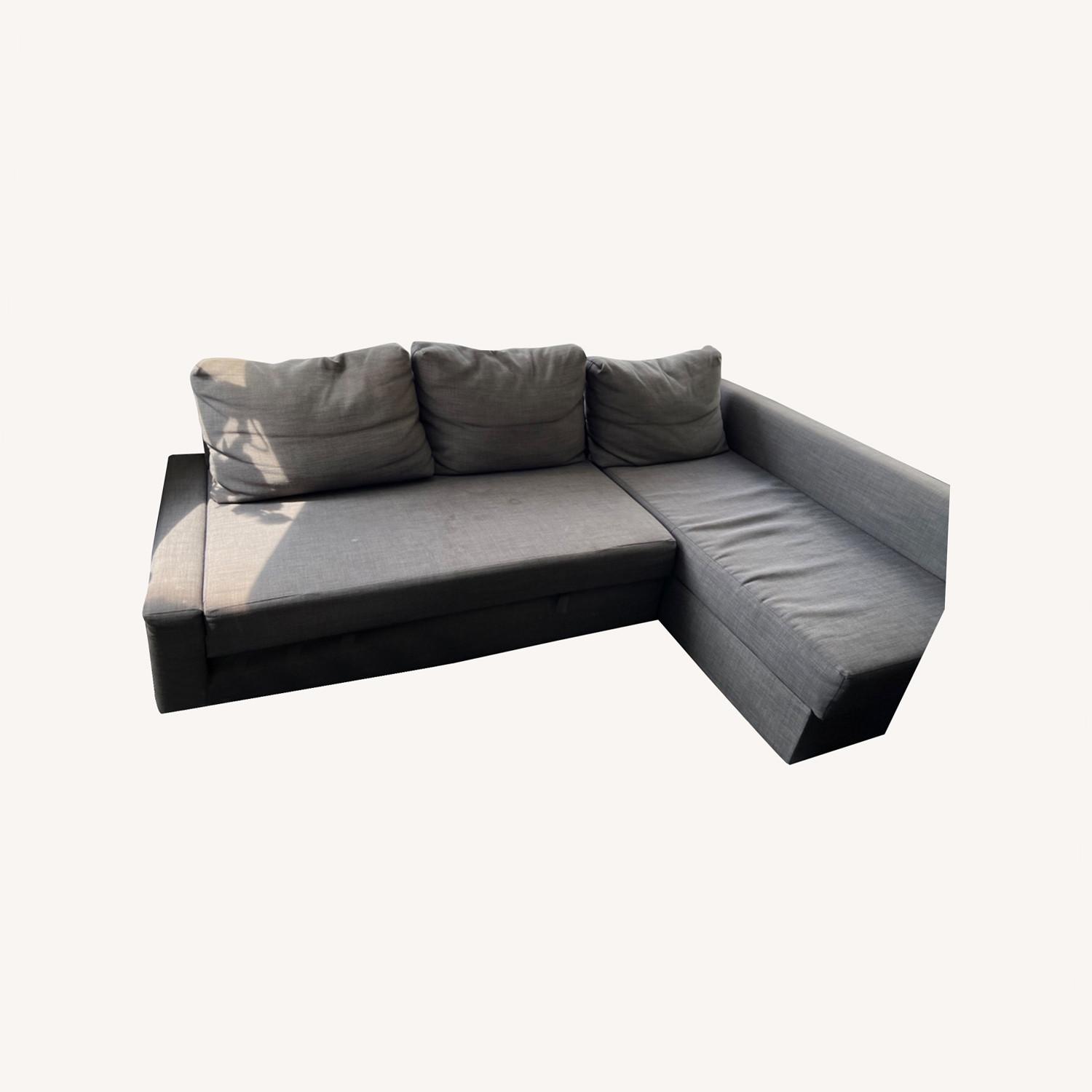 Seller's Notes:Dark Grey Ikea Friheten Sleeper Sofa with storage available. Minor stains that will come off with a clean. This sofa converts quickly and easily into a spacious bed when you remove the back cushions and pull out the underframe. Sofa, chaise and double bed in one. Storage space under the chaise. The lid stays open so you can safely and easily take things in and out. You can place the chaise section to the left or right of the sofa, and switch whenever you like