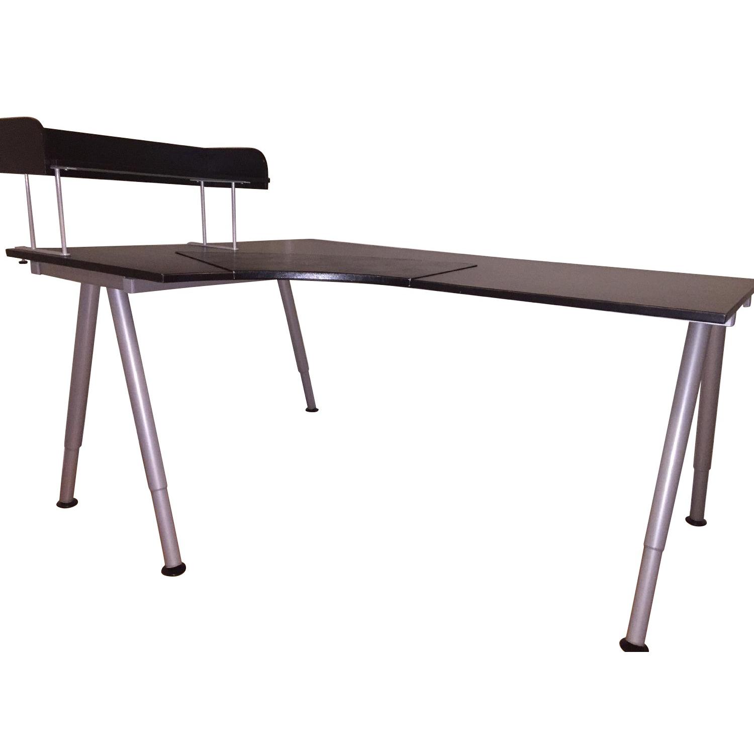 Seller's Notes:There are 3 elements here, (1) Legs and Desktop (2) Shelf Unit on the left (3) protective leather pad (black) Length: 63 " Width: 47 1/4 " Min. height: 23 5/8 " Max. height: 35 3/8 " Max. load: 176 lb 6 oz. (Metric) Length: 160 cm. Width: 120 cm. Min. height: 60 cm. Max. height: 90 cm. Max. load: 80 kg. The contoured table top provides support to the wrists and forearms when writing. Deep table top gives a generous work surface and lets you sit at a comfortable distance from the computer monitor. You can mount the table top at a height that suits you since the legs are adjustable between 23 5/8-35 3/8". The veneer surface is durable, stain resistant and easy to keep clean. Corner table top left: Particleboard, Paper, Stained Birch veneer with acrylic lacquer Frame for corner table top: Steel/Gray color
