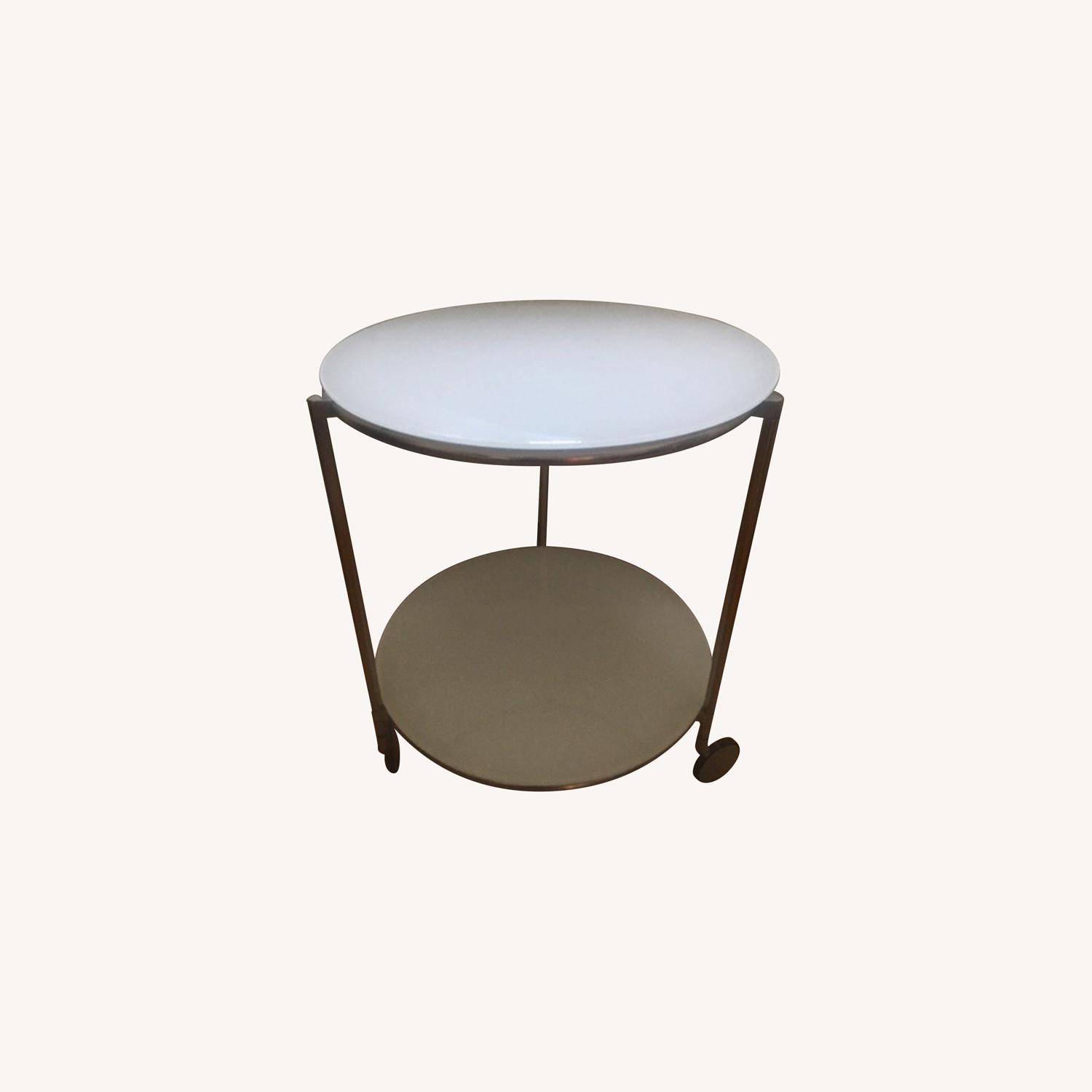 Seller's Notes:Ikea glass side table in white in great shape. Top shelf height 24" and bottom shelf height 6.5".