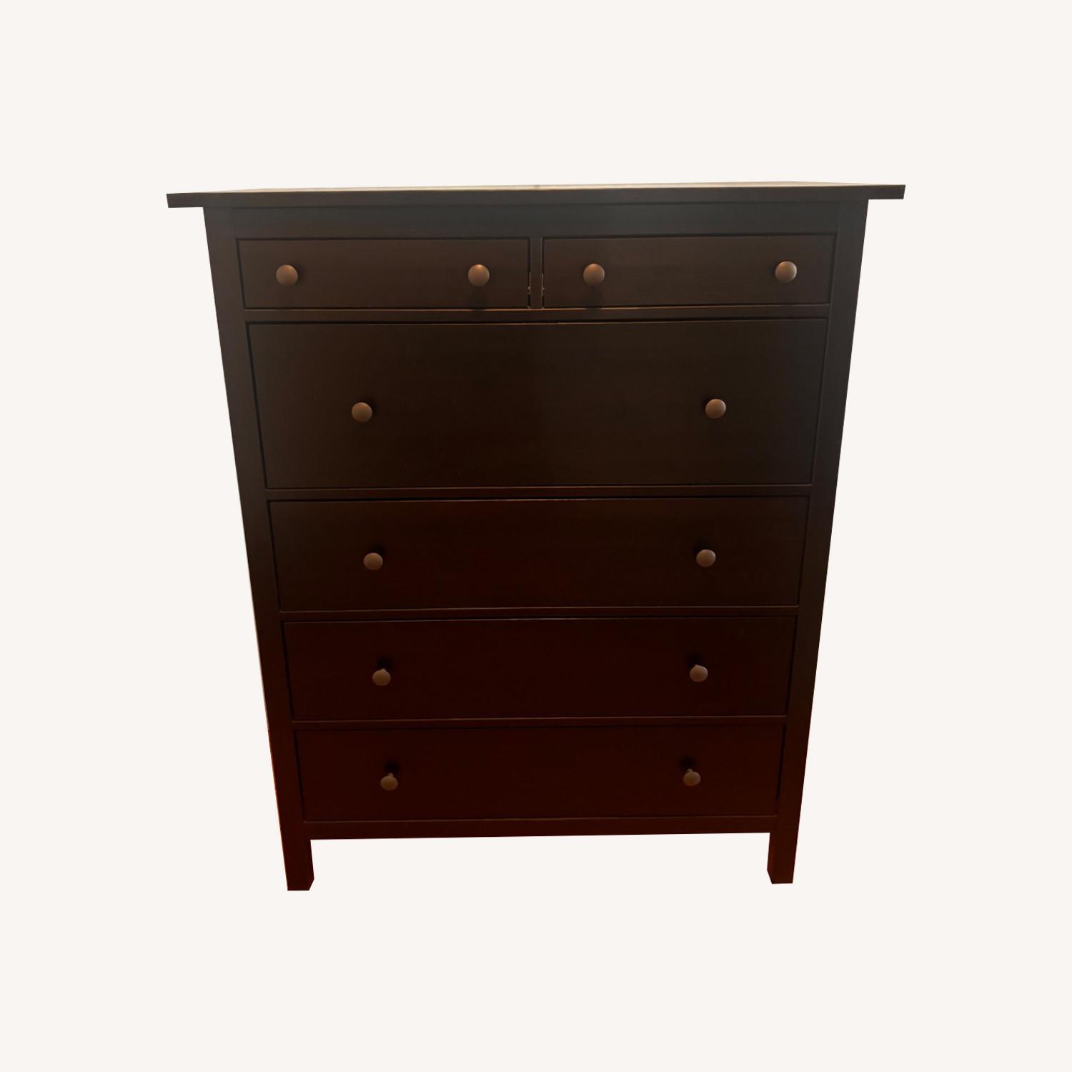 Seller's Notes:IKEA black-brown Hemnes dresser provides ample storage in a mid-century design. The dresser is constructed with solid wood and veneer, and each drawer lining includes a playful striped pattern. The dresser has minor scratches but not noticeable.