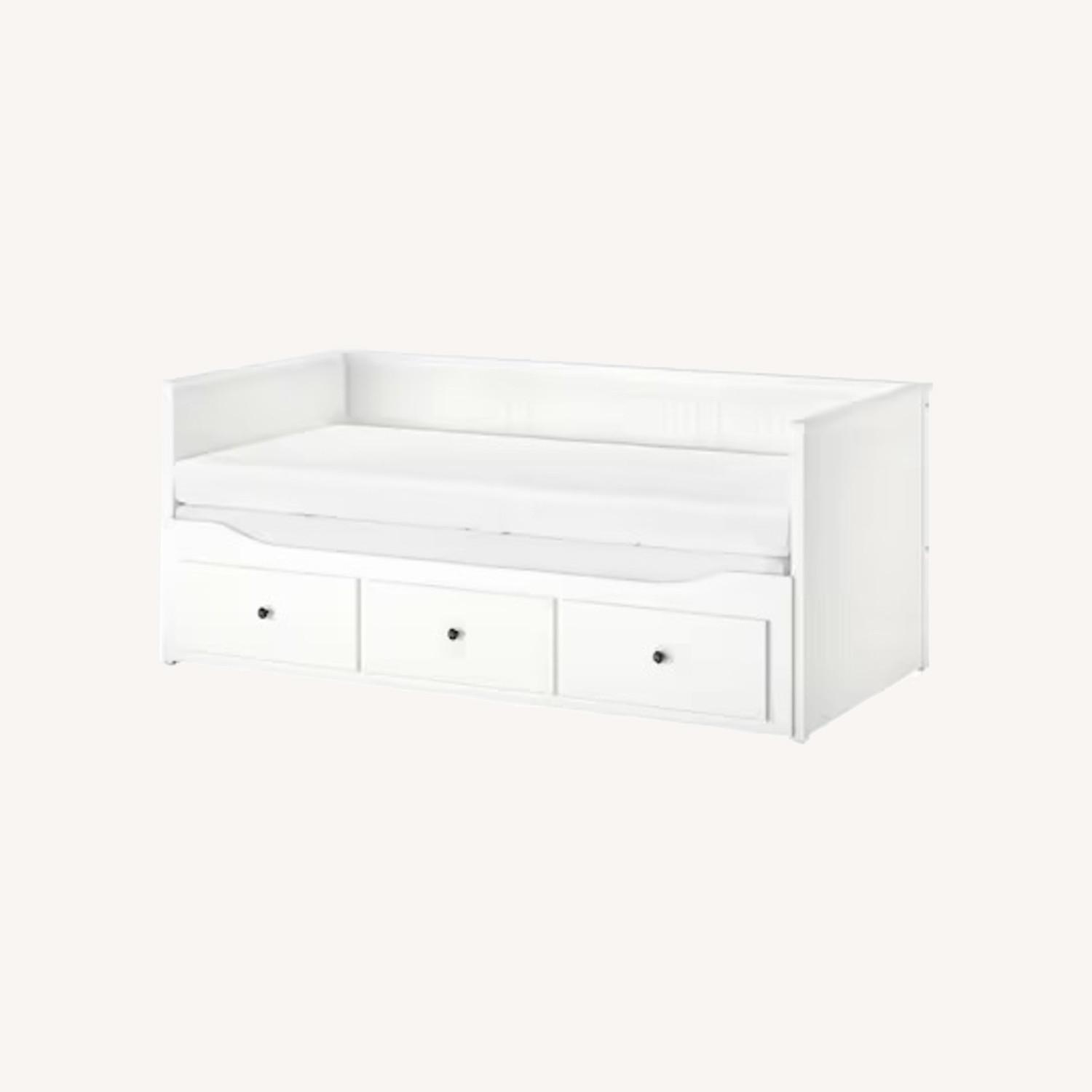 Seller's Notes:The large drawers have space for extra comforters, pillows, linens or other things you need to store, but want to have close at hand. The high frame creates a cozy cocoon feeling, and is lacquered so that it's easy to maintain. You will get all-over support and comfort with the resilient foam mattress. With some soft, fluffy pillows as back support, you easily transform this day bed into a comfortable sofa. The mattress is approved for seating, as the zipper is placed on the bottom. The daybed must be combined with two twin mattresses. They are placed on top of each other when you use the daybed as a single bed, and next to each other when you use it as a double bed. Bed linen sold separately. Two MEISTERVIK foam mattresses included. Slatted bed base is included.
