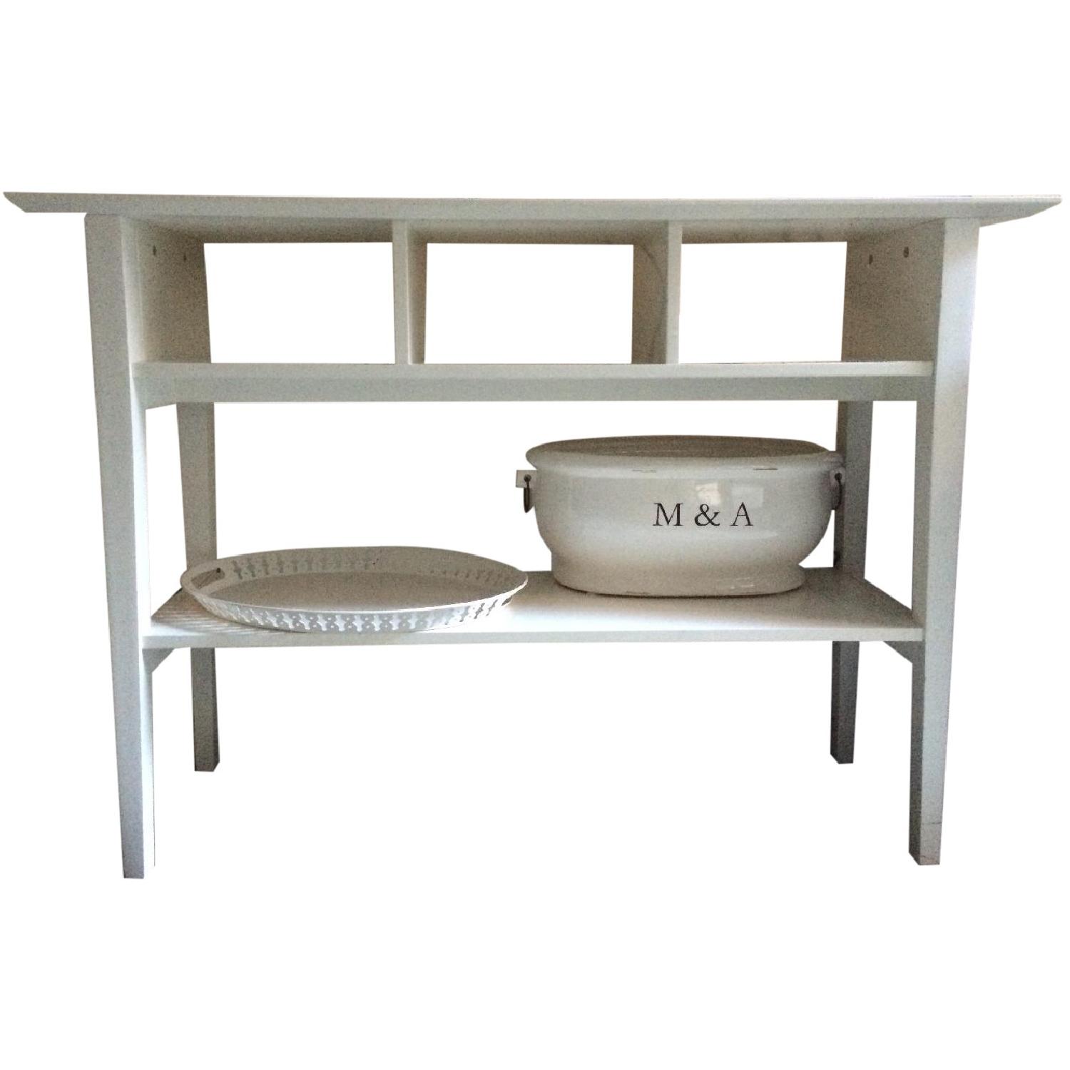 Seller's Notes:We are redecorating and need to get rid of this sofa table. It's barely been used and we cannot find any blemishes on it. It's slightly smaller than the current model at ikea, so it has 4 compartments instead of 8. This should make it easier to fit into an entryway or smaller space. Link: http://www.ikea.com/us/en/catalog/products/00251814/ Solid wood has a natural feel.8 compartments in two different sizes. Convenient storage for books, magazines, accessories, etc.Can be placed behind a sofa, along a wall, or be used as a room divider.