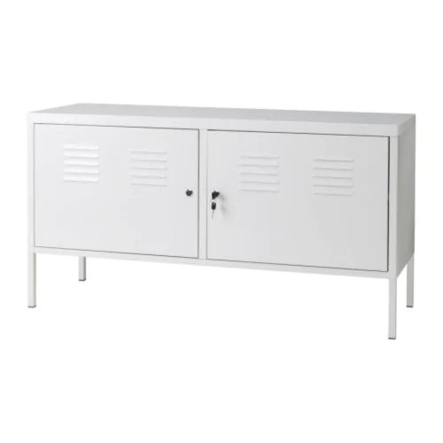 Seller's Notes:Industrial style off-white metal media cabinet. Great condition from pet-free, smoke-free home. Moving and need to sale. A cord outlet underneath makes it easy to gather all cords in one place. The door is lockable so your possessions stay safe. Tall legs make cleaning easy.Width: 46 7/8 " Depth: 15 3/4 " Height: 24 3/4 " Max. load: 132 lb Max screen size/flat screen TV: 36 1/4 "