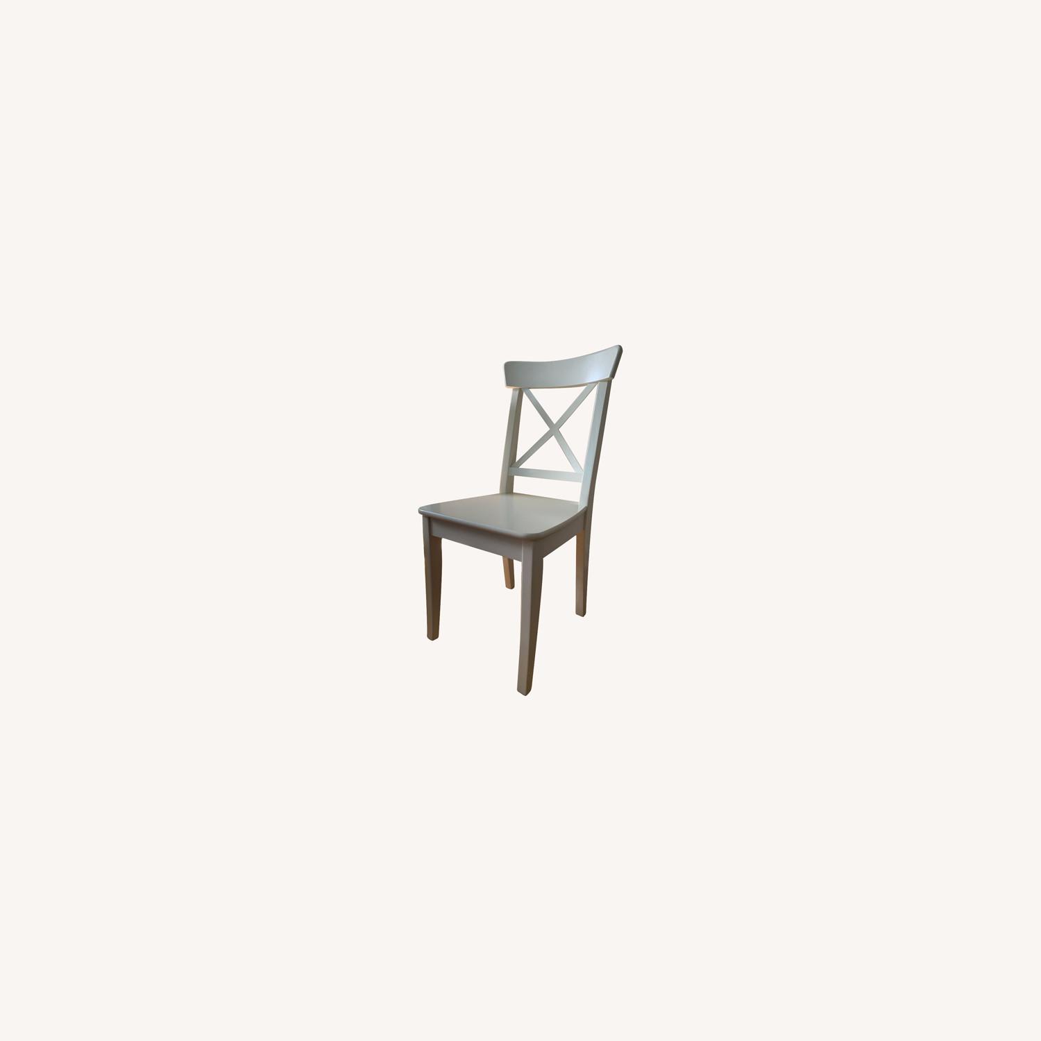 Seller's Notes:Pair of white IKEA INGOLF wooden chairs. Great condition. Works well as dining chairs. Exact dimensions are 16 7/8"(W) x 20 1/2"(D) x 35 7/8"(H), Seat width: 16 7/8" x Seat depth: 15" x Seat height: 17 3/4". Tested for: 243 lb