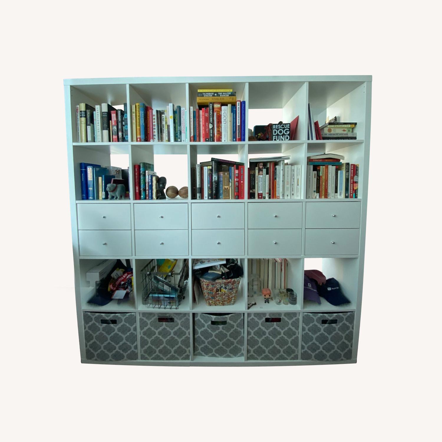 Seller's Notes:Sturdy storage unit. Selling with five 2-drawer inserts (originally $22 each). Not selling with 5 gray storage boxes pictured in bottom row.