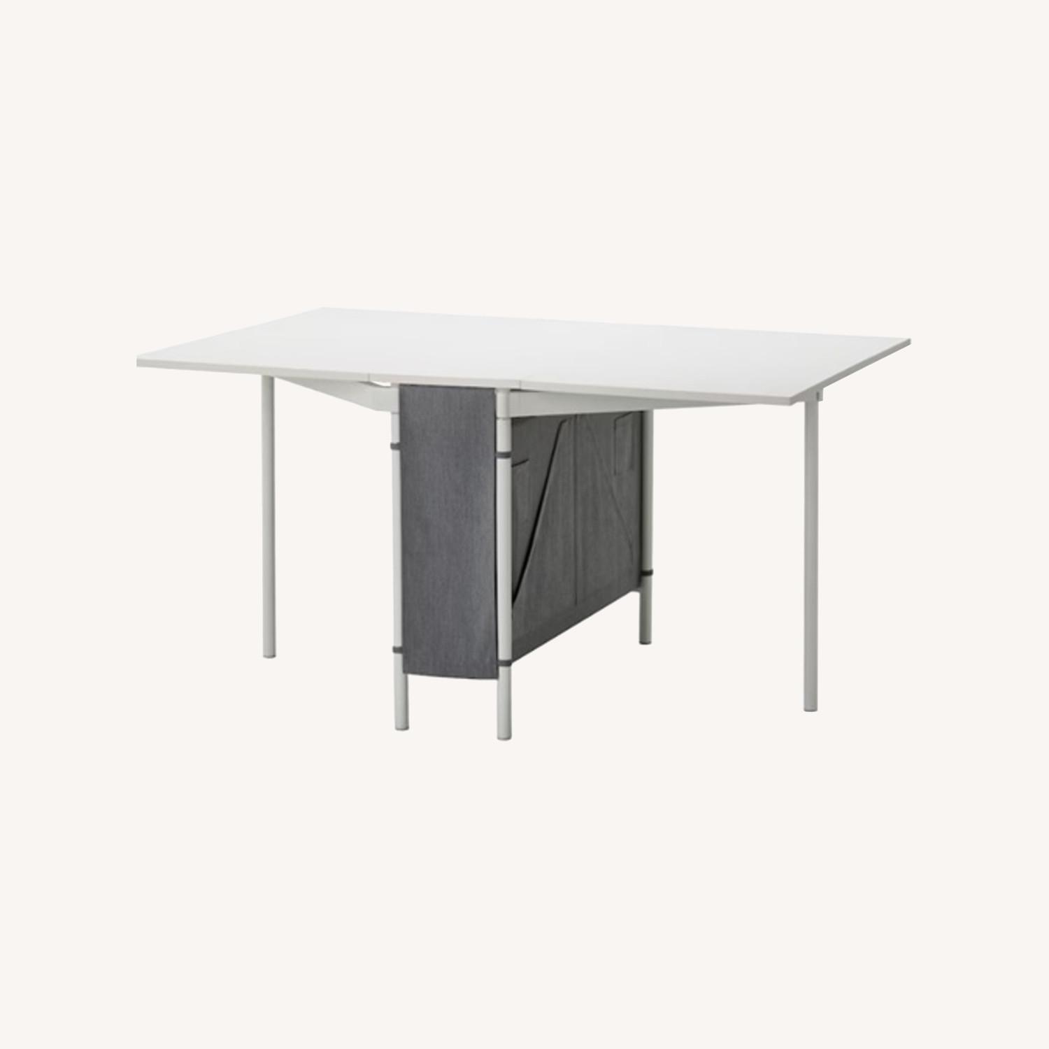 Seller's Notes:Owned this for 2 years, it's ideal for everything from dinners to game nights to craft projects. Esp. perfect for our NY apartments (eg , small spaces) - both sides of the table fold up and down, so it can go from a thin shelf to a full-size table that seats 4 comfortably. The table has a spacious storage compartment in the center column with room for 2 of the folding chairs, plus fabric pockets for organizing books, remotes, chargers, etc. If the white didn't clash with our new decor I wouldn't be selling it honestly.