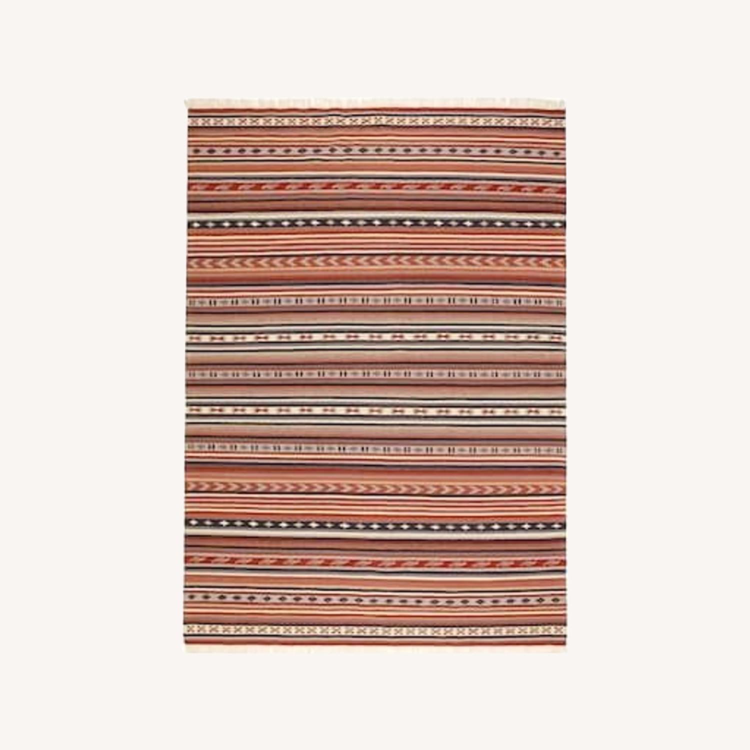 Seller's Notes:We have absolutely loved this rug. It's approximately 5ft x 7ft (see exact measurements in inches) and is in great shape despite being in various rooms for the past few years. It's extremely durable -- would be great for a family with kids or pets. There are no obvious stains, just a bit of discoloration on the fringe and some lighter spots from being in the sun.