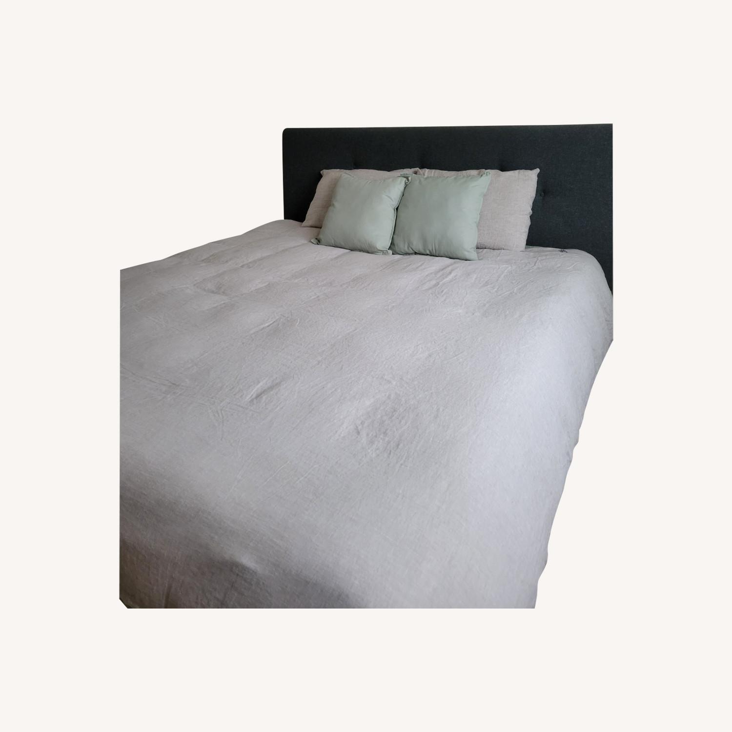 Seller's Notes:modern king-sized bed frame upholstered in a blue fabric. Durable and designed to complement various decors. Easy to assemble and reassemble and parts are light enough to be moved by a single person! Frame will need to be disassembled to move