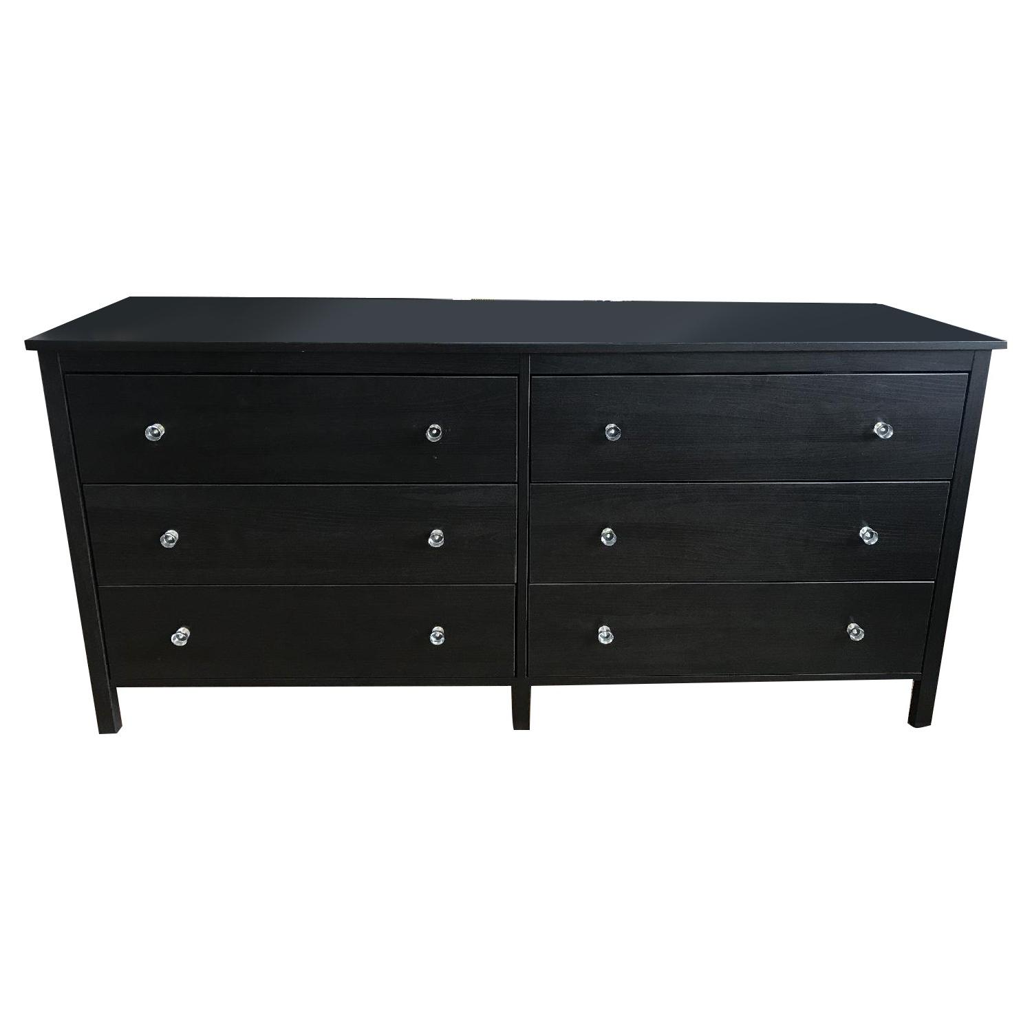 Seller's Notes:Large Ikea KOPPANG 6 drawer dresser in brown/black with CB2 acrylic cylinder knobs. 67 3/4" x 32 5/8". This is a very sturdy spacious dresser. Owned for 2 years. Very good condition with 1 small chip on the back edge (see image) - could be sharpied in very easily. Knobs were over $120 at CB2 which adds value to this Ikea dresser