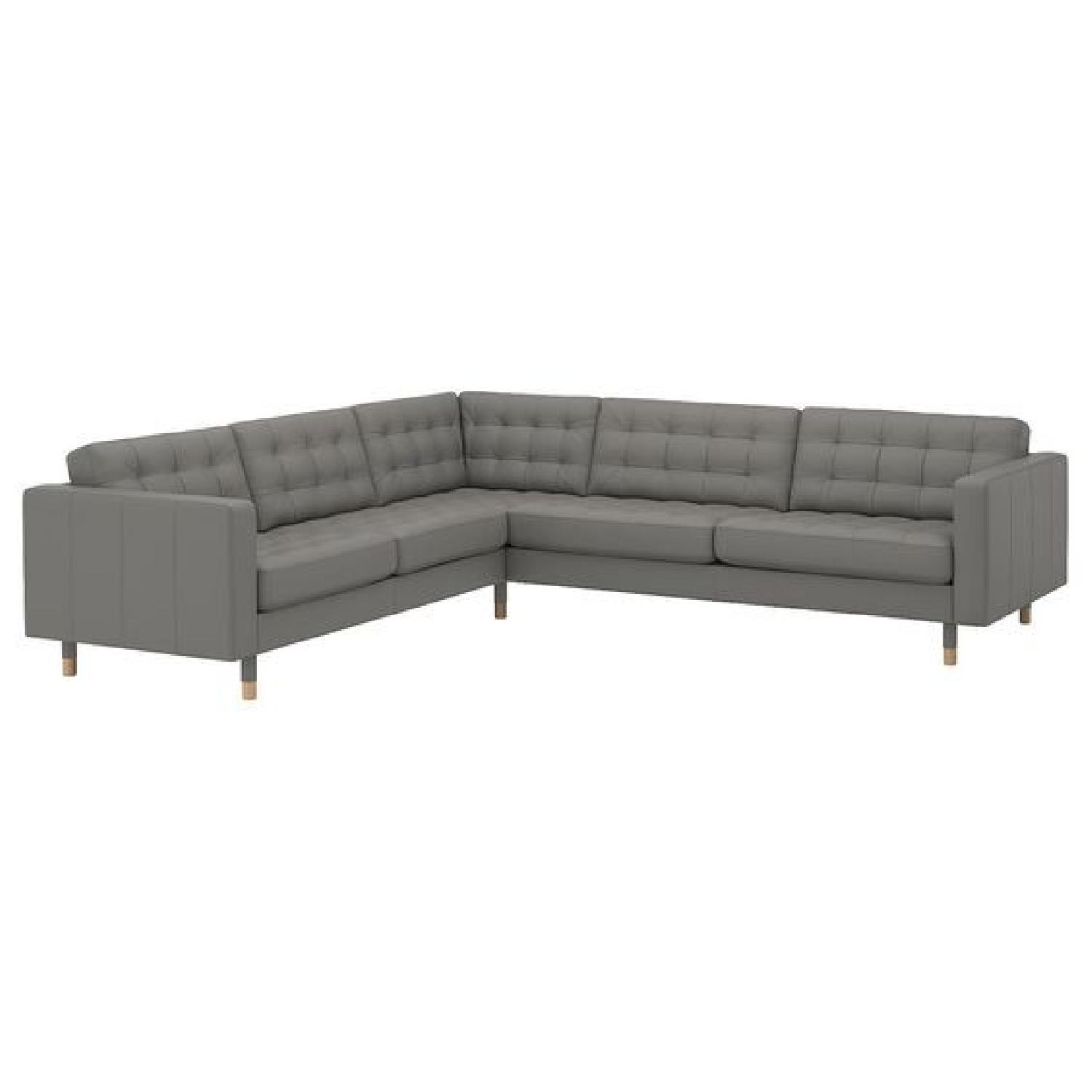 Seller's Notes:IKEA LANDSKRONA Sectional, 5-seat corner, Grey leather, with wooden legs. Foam filling, thick grain leather on the contact areas, and durable coated fabric elsewhere. Large sofa that comfortably seats 5 people. Great condition. Three years old, and no scratches or marks on leather. Sofa looks really good, and we would have kept it if we were not moving. We do not have animals, are non-smoking, and have had limited use of the sofa due to traveling. Product dimensions Depth: 35 " Height: 30 3/4 " Width right: 110 5/8 " Width left: 94 7/8 " Seat depth: 24 " Seat height: 17 3/8 "