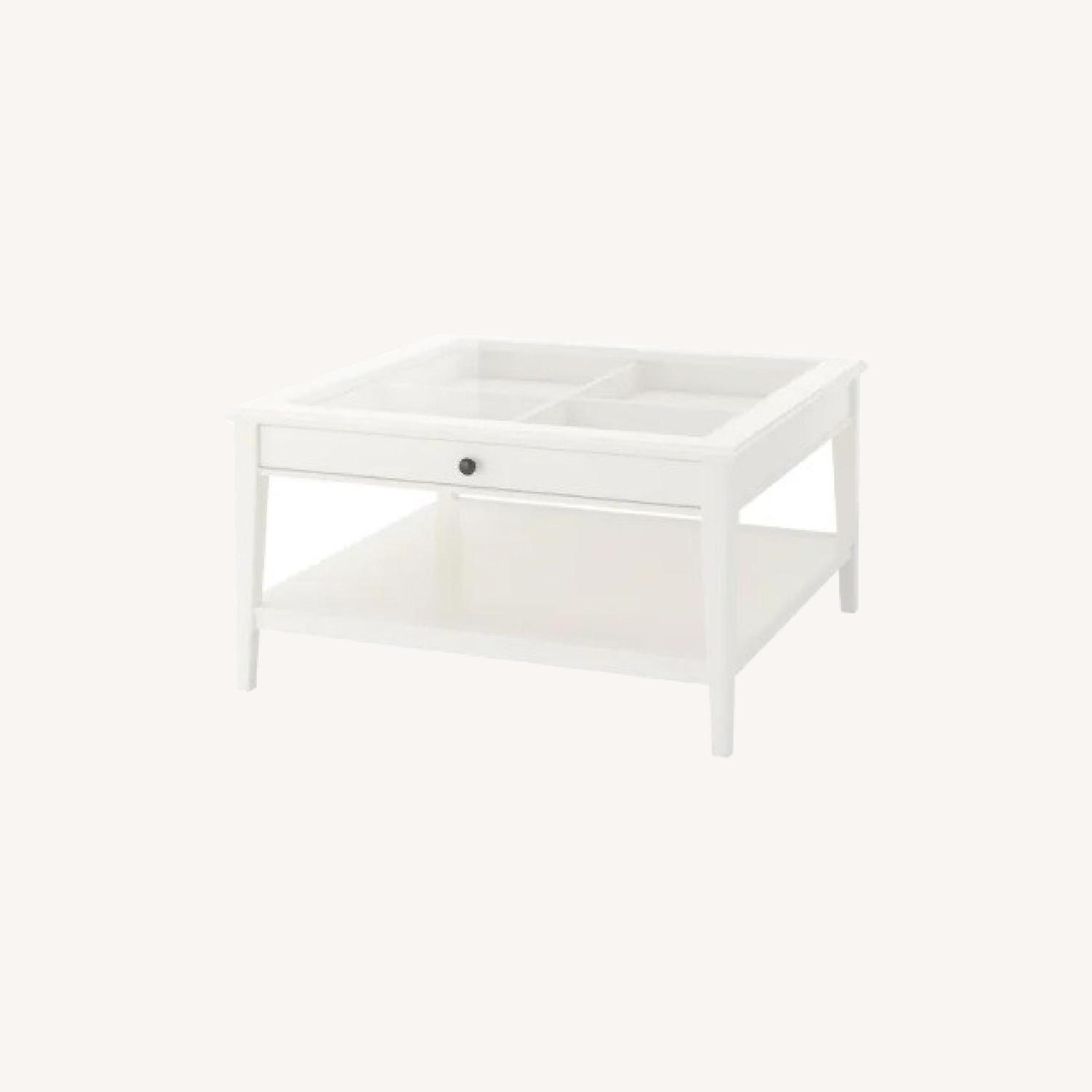 Seller's Notes:Used IKEA liatorp coffee table. Features glass top with drawer to include Practical storage space underneath the table top. Separate shelf for magazines, blankets, etc. helps you keep your things organized and the table top clear.