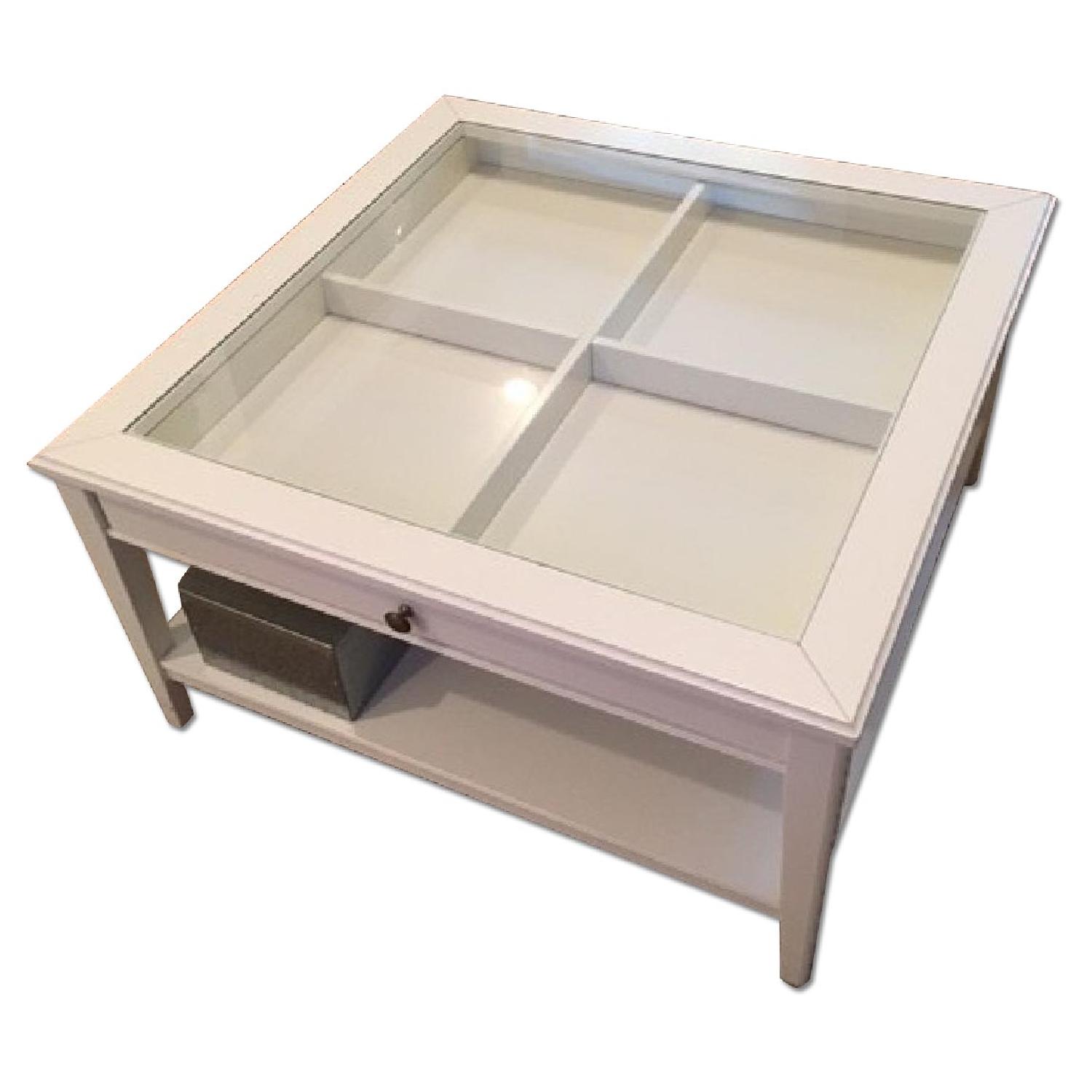 Seller's Notes:Beautiful, sturdy and well cared for coffee table. Excellent condition, very minor scratches on bottom shelf and top corner. Drawer slides out so can display items in the four display areas beneath the glass. Knobs for drawer are brushed nickel. Moving to California. Matching TV stand/credenza also available, as well as selection of other living room and bedroom furniture.