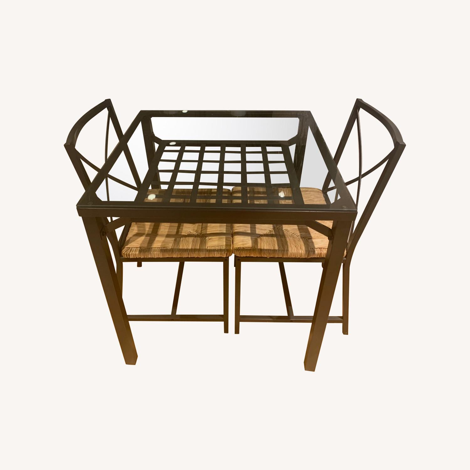 Seller's Notes:Sturdy and compact dining set complements many decors. Add seat cushions for a little extra comfort. Table (length 28¾", width 28¾", height 29½"). The table top made of tempered glass is easy to clean and more durable than ordinary glass. Product dimensions: Table length: 28 3/4 " (73 cm) Table width: 28 3/4 " (73 cm) Table height: 29 1/2 " (75 cm) Total height: 33 7/8 " (86 cm) Chair (width 16", depth 19", height 33?", seat height 18", seat width 16", seat depth 15"). Frame/ Magazine shelf/ Leg: Steel, Epoxy/polyester powder coating. Seat frame: Solid eucalyptus wood. Seat: Flax straw. Seat width: 16 1/8 " (41 cm) Seat depth: 15 " (38 cm) Seat height: 18 1/8 " (46 cm)