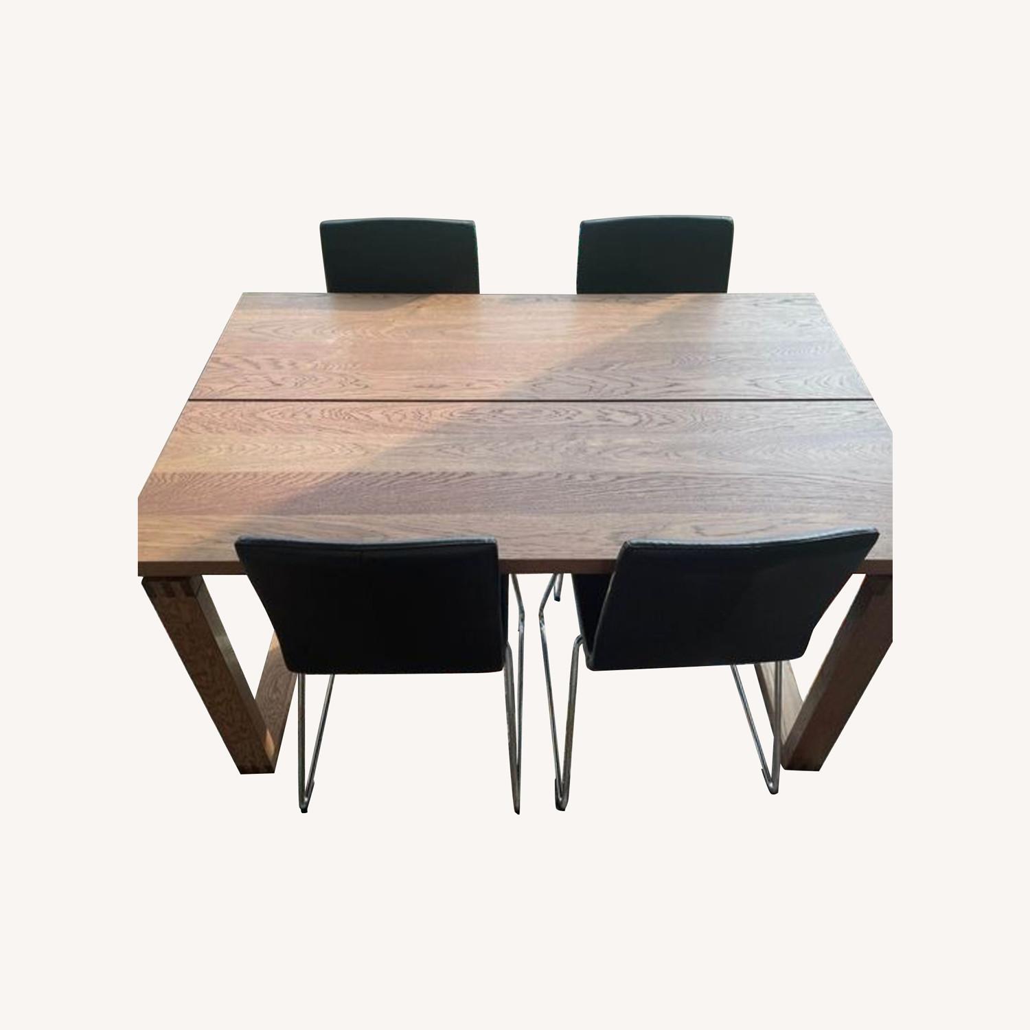 Seller's Notes:MÖRBYLÅNGA dinner table IKEA - up to 4 seats. Measurement: Length: 55 1/8 " Width: 33 1/2 " Height: 29 1/2 " The oak top layer enhances the plank feeling and details like the floating table top and dovetail joints give the table a crafted look. A table full of character and plenty of room for family and friends. LILLÅNÄS Chair, chrome plated/Bomstad black LILLÅNÄS chair in black offers modern appeal and comfort for all-day activities with a padded seat shaped to reduce pressure and a flexy-feel backrest. Worry-free, easy-wipe coated fabric cover.