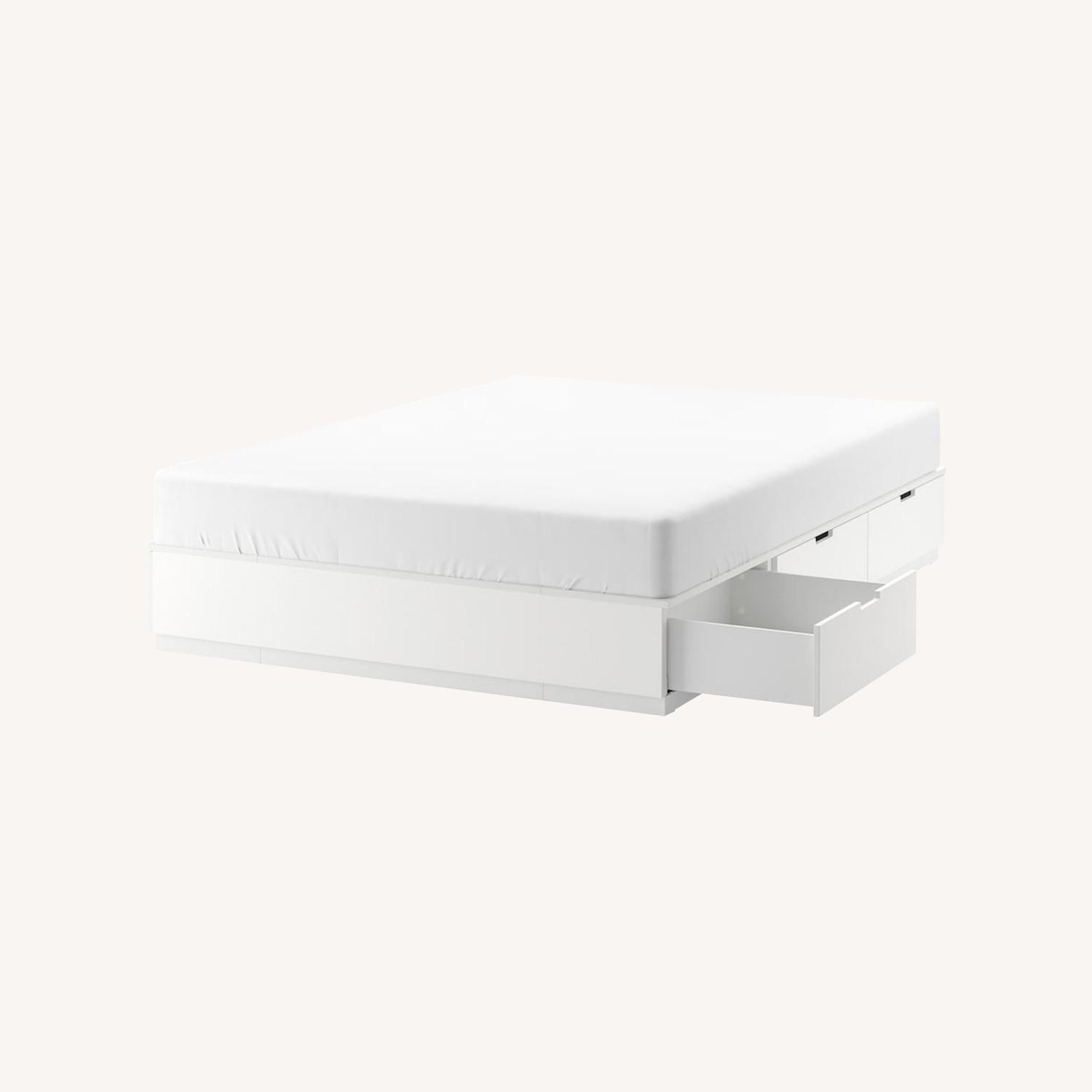 Seller's Notes:IKEA queen bed frame from Nordli line. Frame has 6 storage drawers for clothes, toys, etc. The bed has been great but it's too big for my new place. There is damage to the corner on one end (which can be put against the wall to hide) and scratches from my last move. Comes with bamboo supports for mattress (usually sold separately).