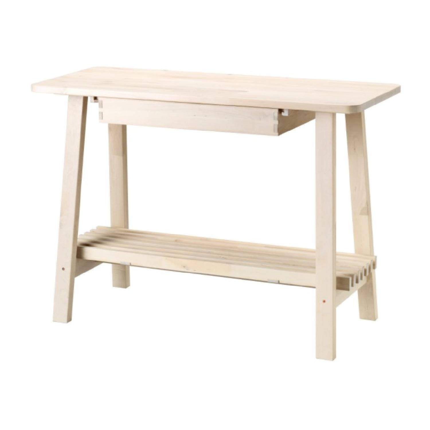 Seller's Notes:We are moving to a new apartment and do not need this kitchen island anymore! Great piece in any kitchen for extra prep space. It has 1 large draw and a shelf on the bottom for extra kitchen items.