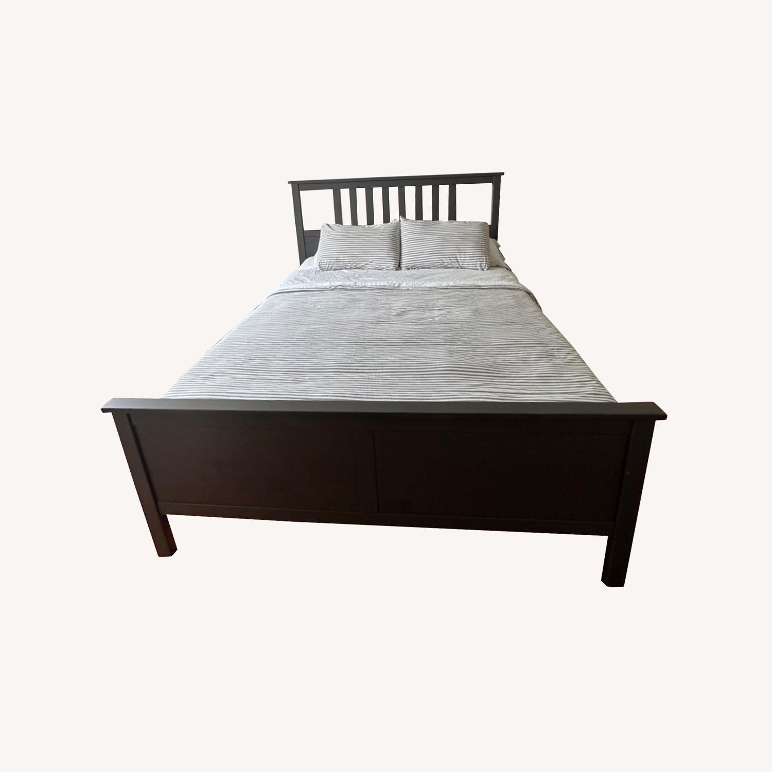 Seller's Notes:IKEA HEMNES BEDFRAME Bed frame, black-brown/Luröy, Queen. Length: 83 7/8 " Width: 65 3/4 " Only selling because I’m leaving the country! And Mattress!