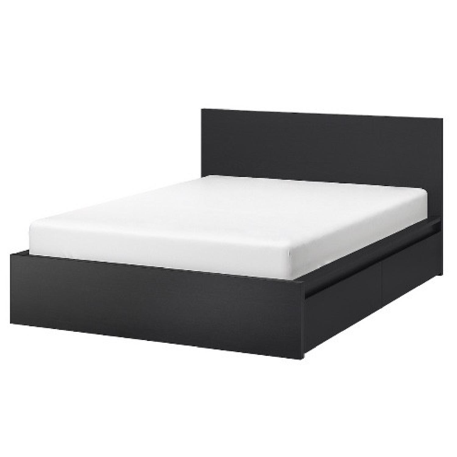 Seller's Notes:Queen bed, dark brown wood, 4 storage drawers. Ikea Malm, high quality slated bed base. Bought 2017, no sign of use, selling only because moving overseas. Also selling large matching dressing.