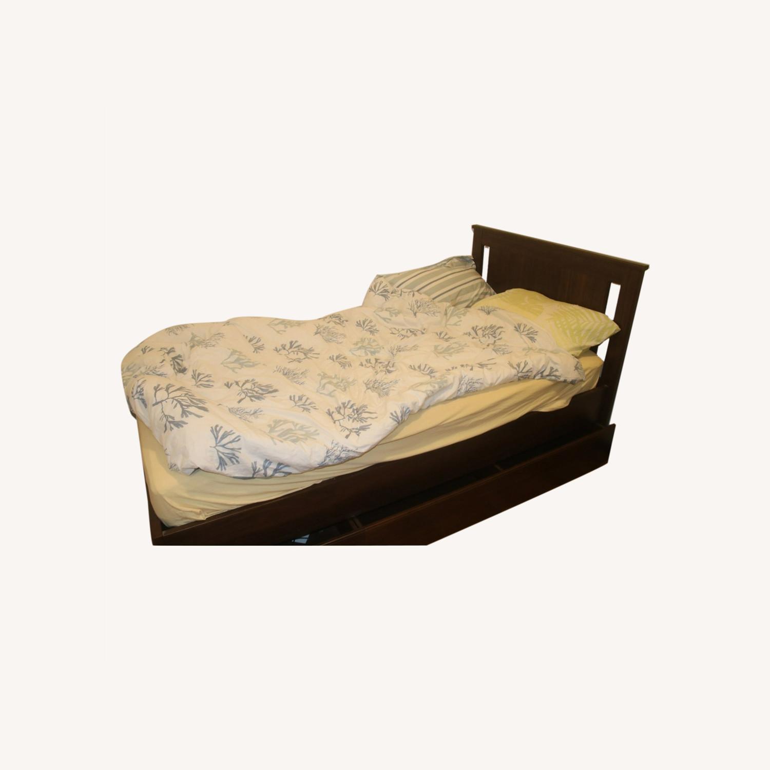 Seller's Notes:IKEA bedframe with slatted base and 2 storage drawers below the bed (one large/one small), giving ample storage space for linen etc. The dimensions include the headboard, but assume the drawers are fully stored (drawer depth is ca. 26"). The frame is in overall very good condition, but has some minor scratches from the initial assembly.