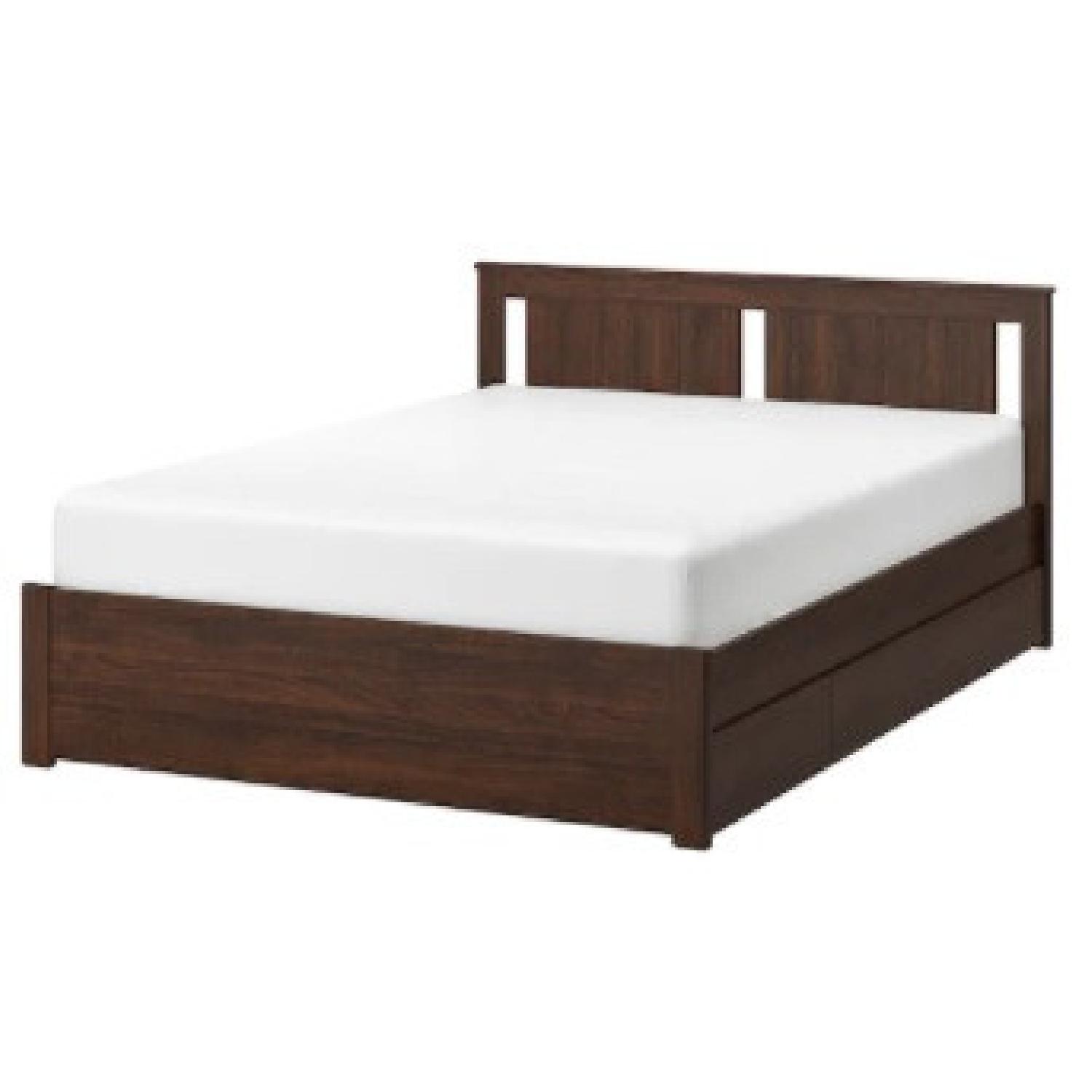 Seller's Notes:Great condition (like new) Ikea SONGESAND bed frame in size FULL with 4 storage boxes - storage drawers are quite spacious and pull out on both sides of the bed. Expensive-looking wood material, dark walnut brown. Have owned it for less than a year. Also have a mattress that I would sell for an extra $50 (owned for 3 years, still in great condition).