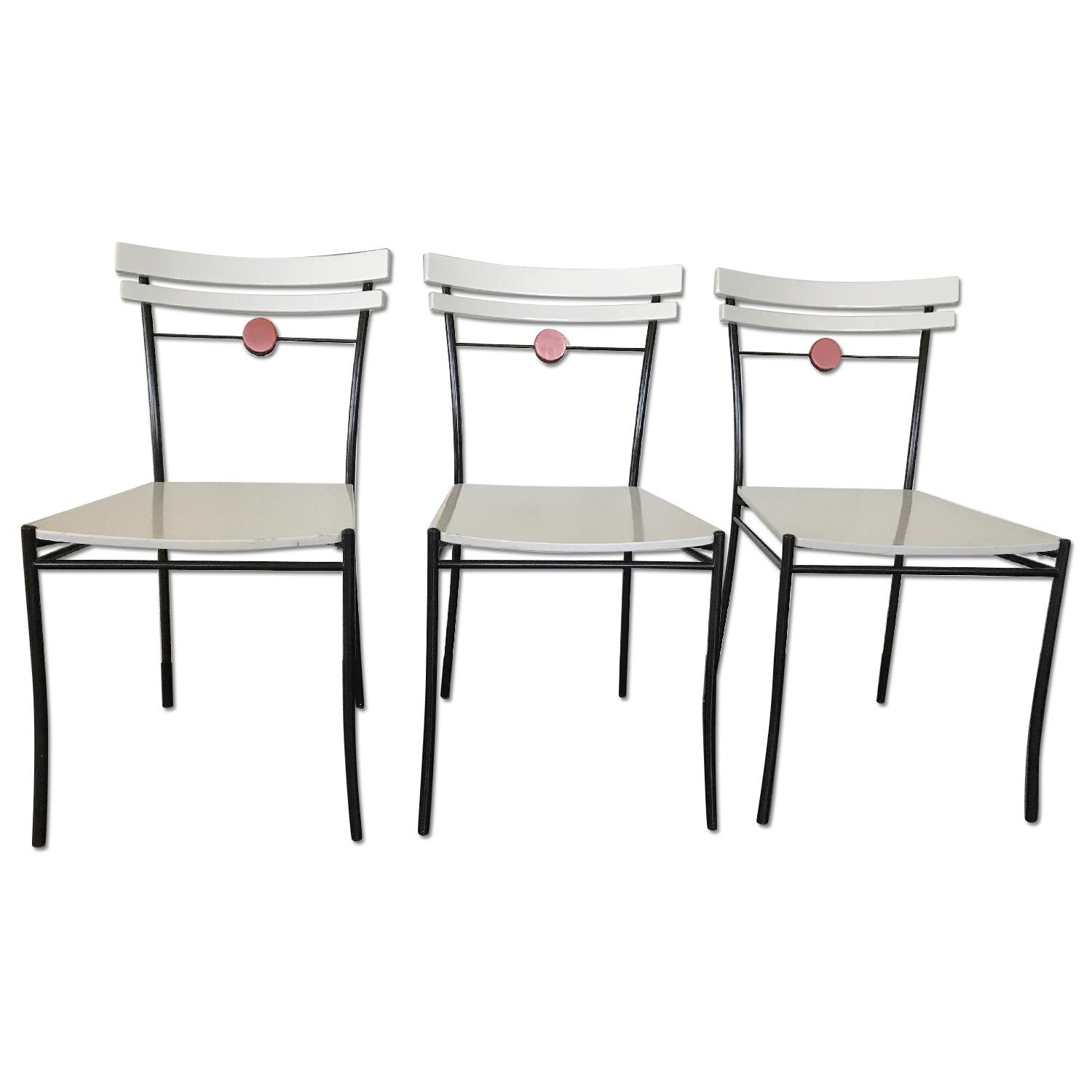 Seller's Notes:Moving sale! This set of 3 contemporary chairs with a simple, yet stylish design, will be a great choice for your kitchen or dinette. These chairs have a sturdy steel construction and wood seat and can be easily cleaned with just a damp cloth. •Color: White + black +red •Material: Steel frame + wood seat There are some minor scratches, overall good condition