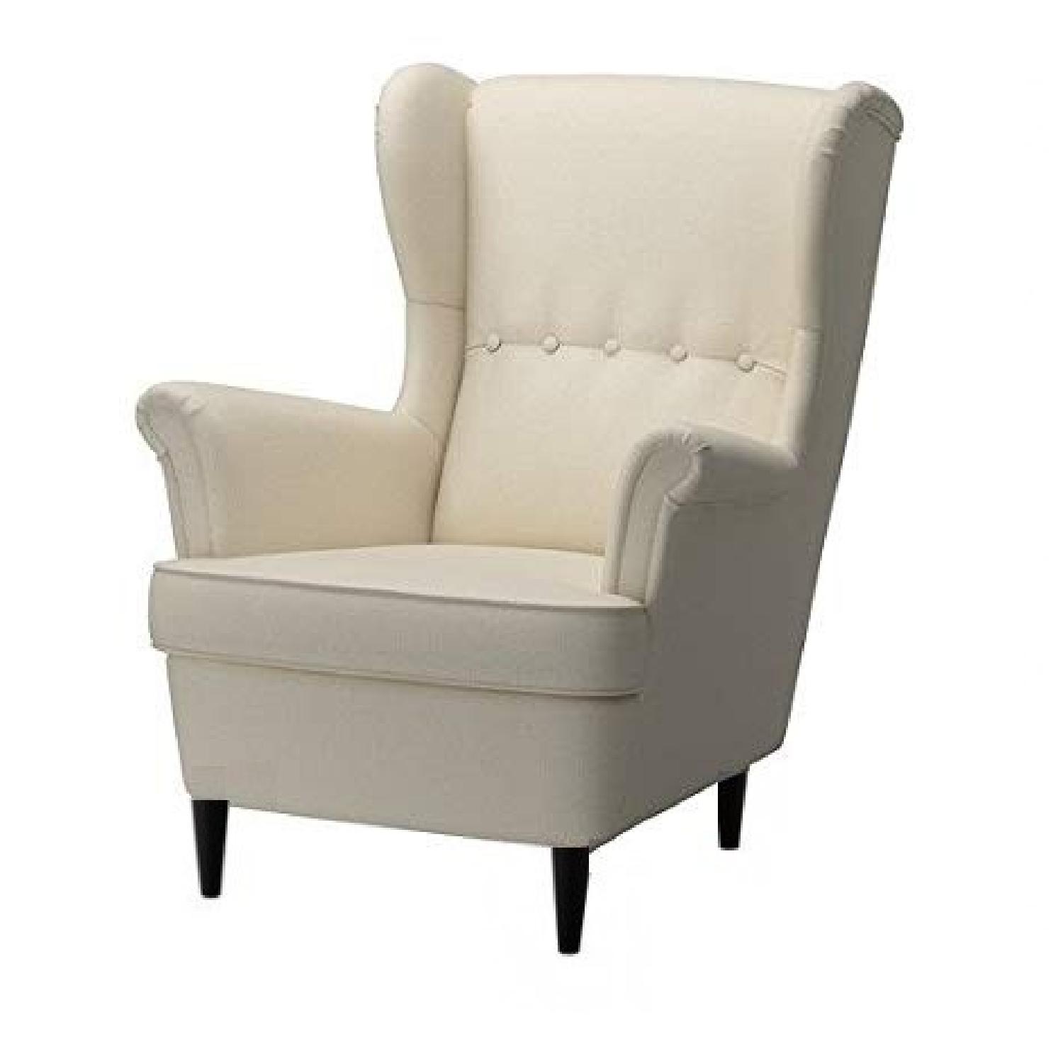 Seller's Notes:The STRANDMON wing-chair in light beige looks like an old-time classic with a modern flare. We bought it gently used for our first apartment and it has become one of our favorite pieces. Very comfortable and sturdy, with some water stains that we cover with a decorate throw blanket. We are moving away and cannot take it with us, but hope it goes to a good home!