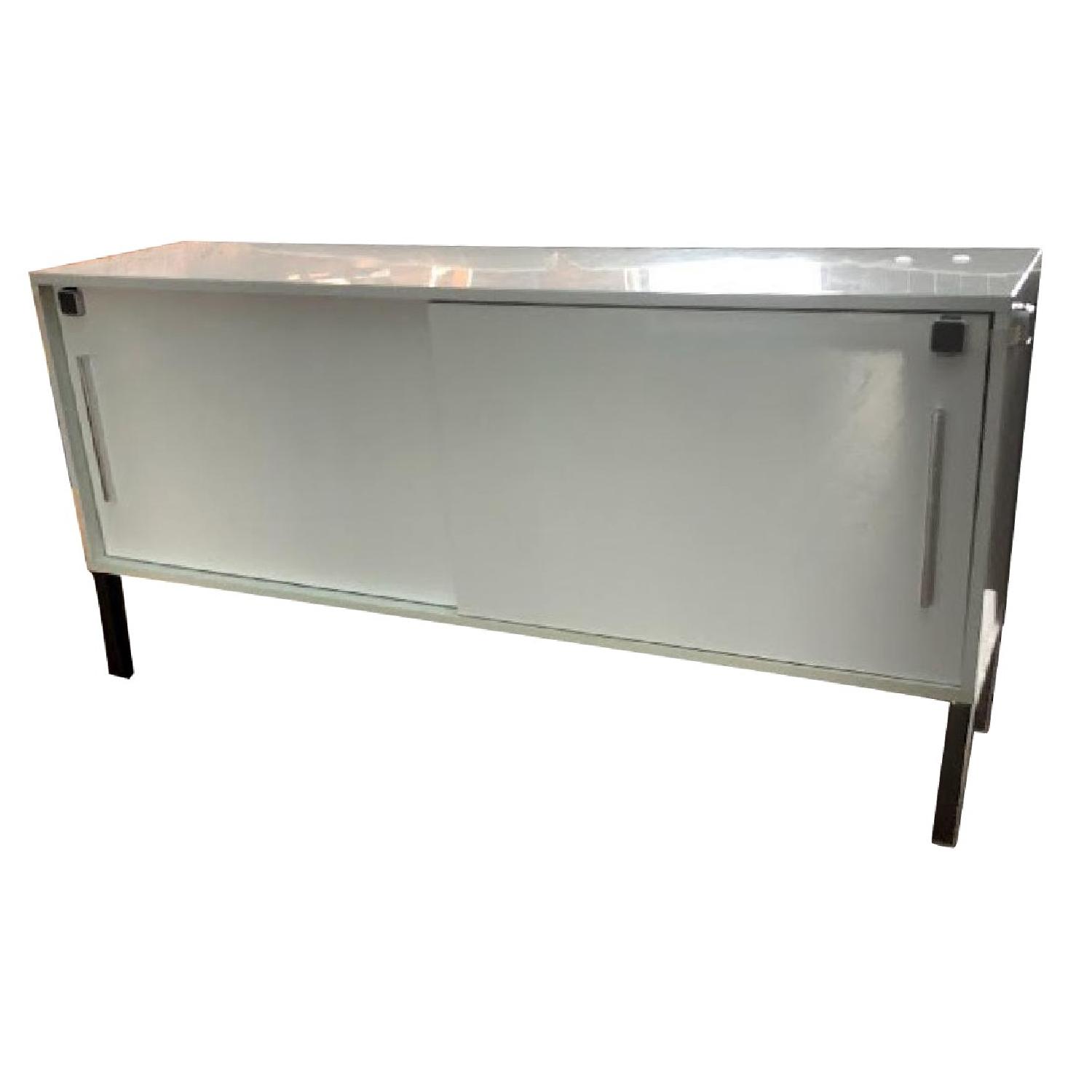 Seller's Notes:Discontinued Ikea Torsby Sideboard in High Gloss White. We've used this as a TV stand, record storage (it's just the right size), and a sofa console table. It has so many uses! The door slide and there are 2 adjustable shelves. There are a few scratches on top you can easily hide, and the back panel was against a window for a time so it warped a bit from rain, you can't tell from the front. There are child-proofing latches on it but they are adhesive and can be removed.
