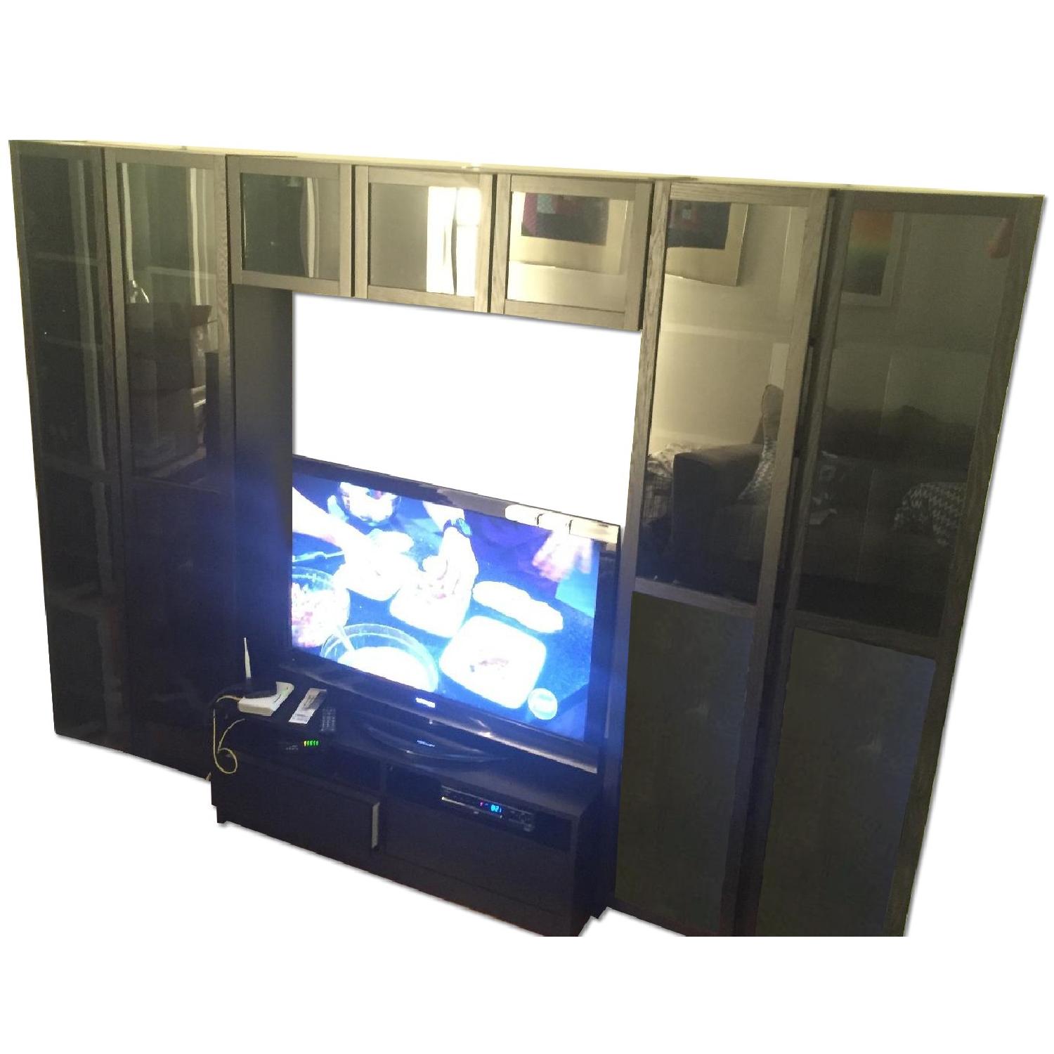 Seller's Notes:Black wood TV wall unit from IKEA. It is a modular unit consisting of 4 pieces. The top center piece must be attached separately. The unit is a great storage piece and can hold a lot!