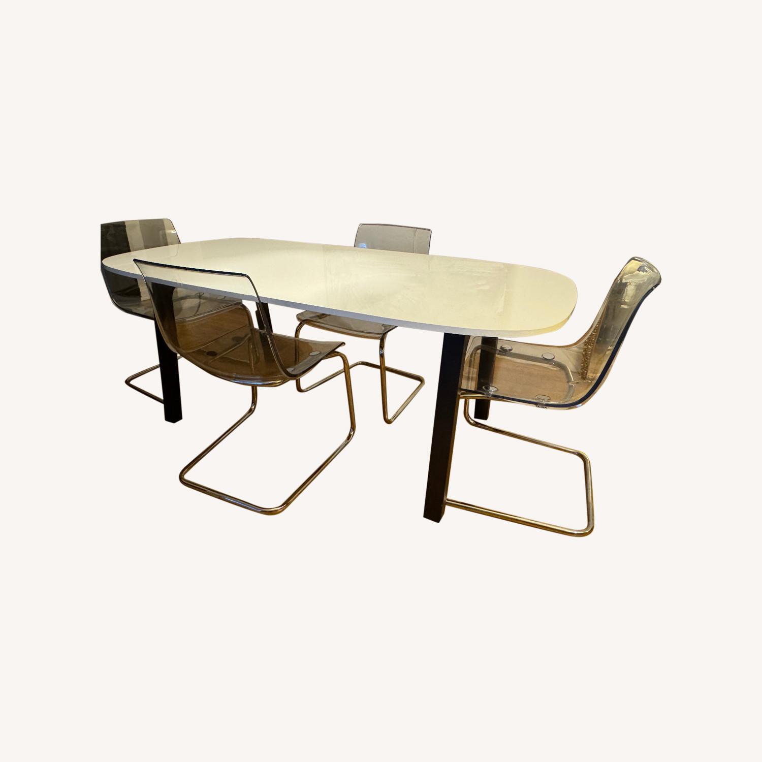 Seller's Notes:Ikea Vastana Oppeby White with white glossy top and dark wood legs in very good condition. Sold with four Ikea Tobias Clear chairs with Chrome finish. Both are sleek modern design. Table dimensions: Width: 72 " Depth: 35 " Height: 28.5 " Chair dimensions: Width: 21 5/8 " Depth: 22 " Height: 32 1/4 " Seat width: 18 7/8 " Seat depth: 18 1/8 " Seat height: 17 3/8 "