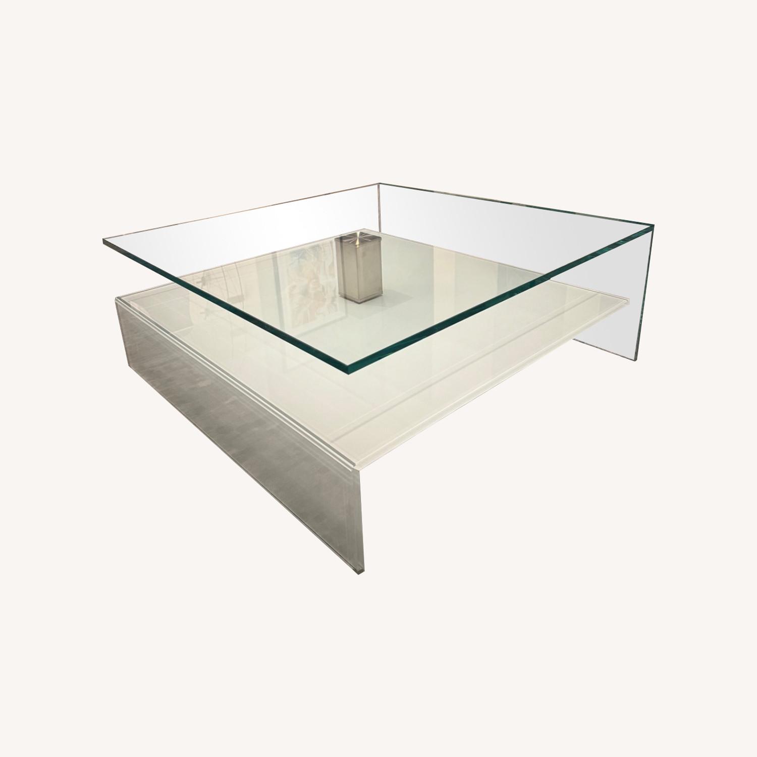 Seller's Notes:This German-made glass coffee table is in superb condition. It is by Dreieck Design. Since 1984, they have specialized in fine glass furniture. This striking model, the Nuo, features two glass angles and a brushed metal central post. The upper glass angle is clear. The lower glass angle is white. This table would be the ideal centerpiece for any modern, contemporary or transitional decor scheme. Perfect for living rooms, reception areas, or any space that needs a touch of remarkable design and durable functionality. We are sad to part with our beloved table, but we have a new baby that we're trying to keep out of mischief with some softer furniture.