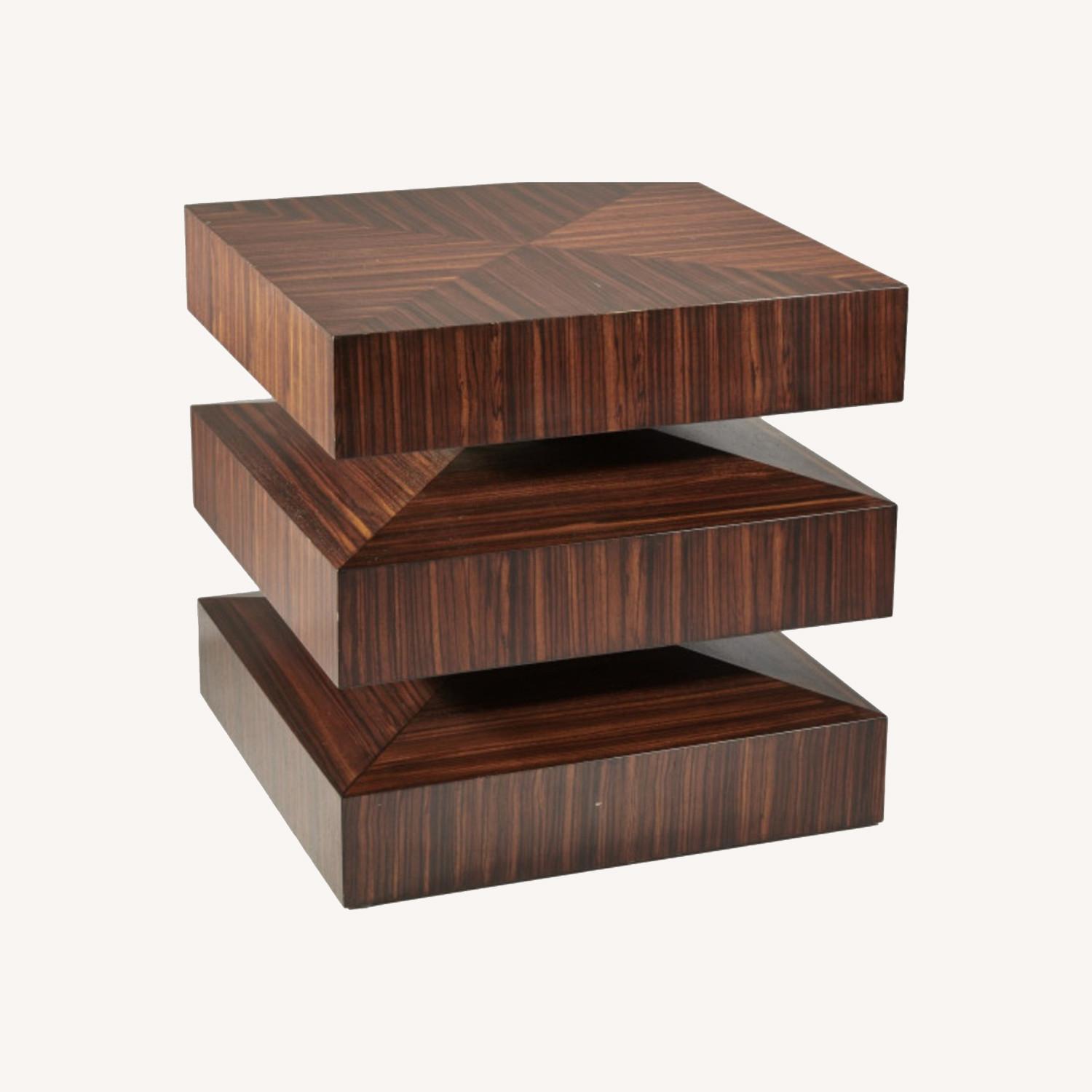 Seller's Notes:Sleek, perfectly polished, will include 2 custom glass tops. The clean lines and beautifully hand-rubbed finish on zebra wood veneer of Global Views' In and Out End Table make this set unique. The size and scale of the item offers amazing flexibility, making it a stunning addition to any room in your home!
