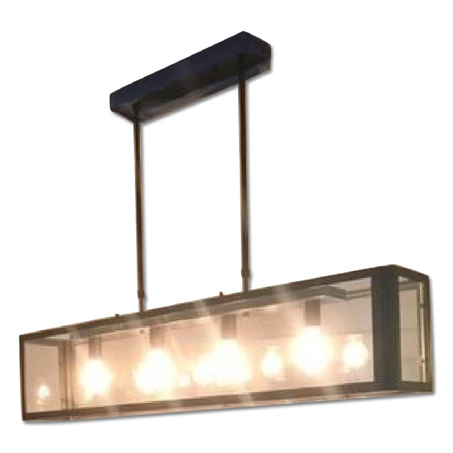 Seller's Notes:Industrial ceiling lights, with 4 bulbs- made of metal and glass. Total drop from ceiling just shy of 34 inches.