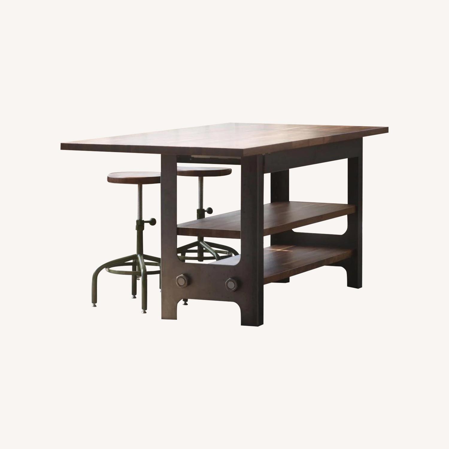 Seller's Notes:This was custom built for our family in 2019. The legs/base are steel and the butcher block work top is 1.5"-inch thick walnut. In addition to the two open shelves visible below the work top, there are two 18" x 18" utensil drawers on the 'standing' side of the island. We're also including two matching stools that tuck underneath the 'sitting' side of the island.