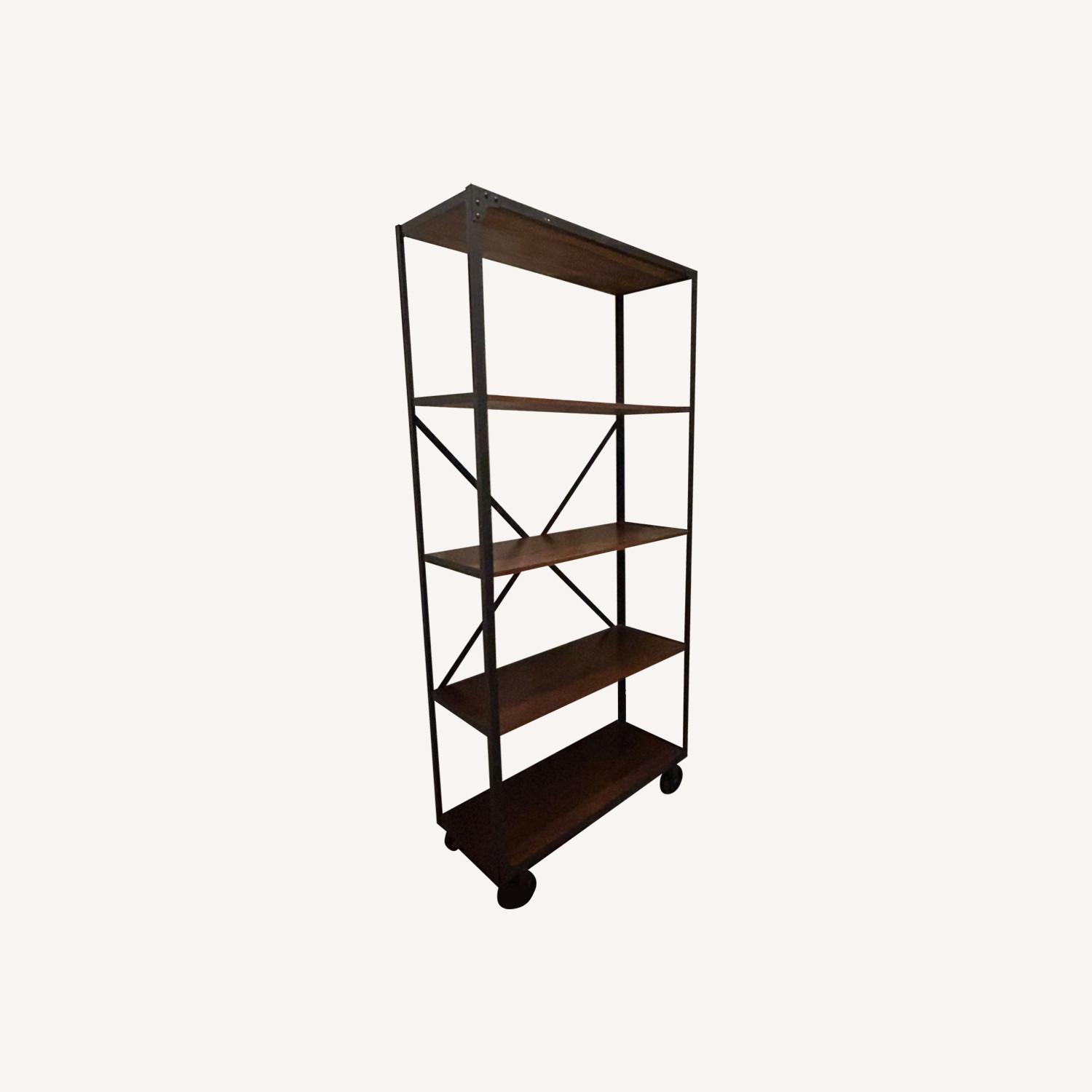 Seller's Notes:This is a fantastic tall etagere bookcase on wheels, with brakes and pins for safety. Very sturdy, no signs of wear that I can see. The frame is metal the shelves are wooden. The three middle shelves are removable. It’s a great piece just doesn’t fit in the house anymore. Hopeful someone will love it! I’m open to offers.