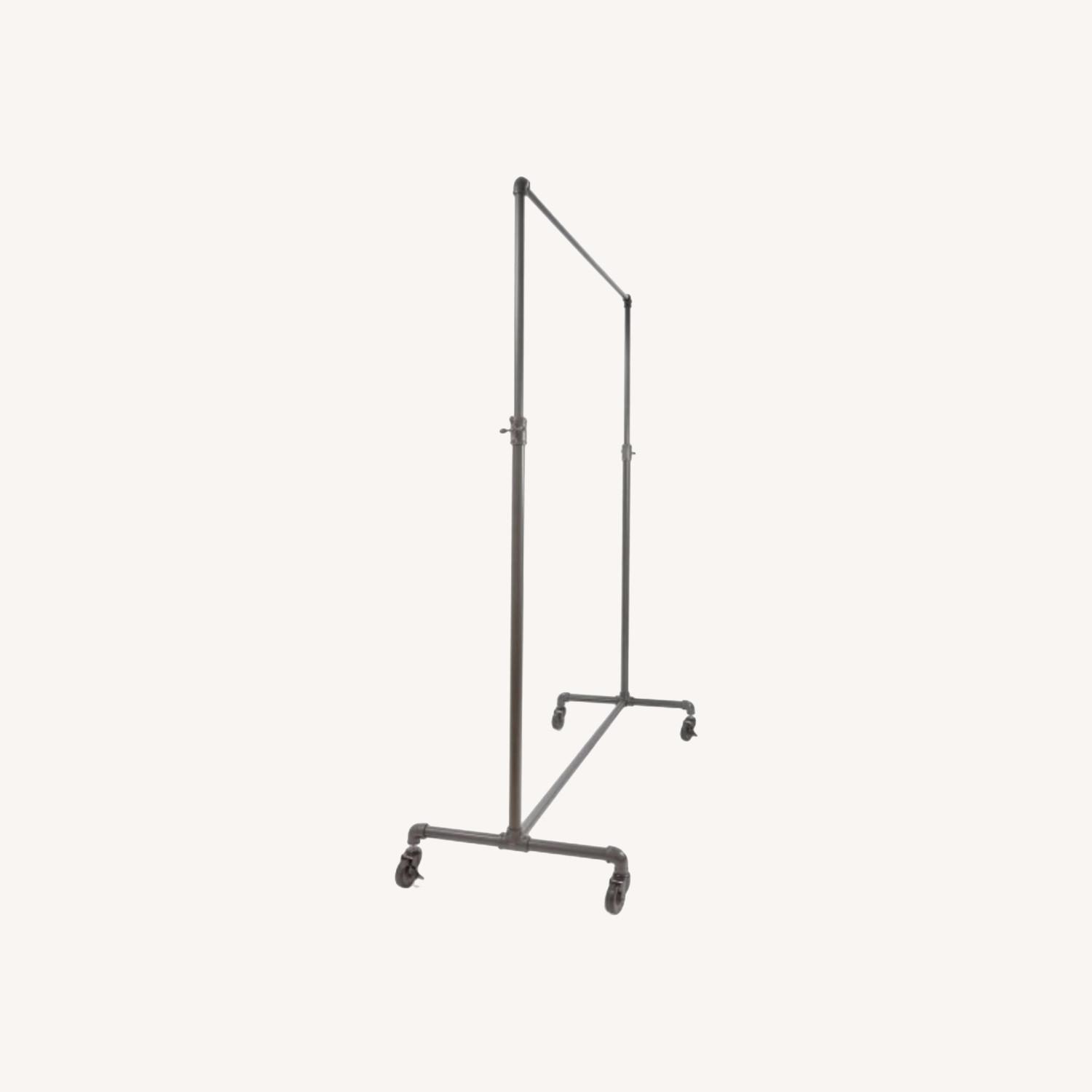 Seller's Notes:Details Adjusts from 44" - 72" in height. Base: 60"W x 23-3/8"D. Constructed of heavy duty 1 1/4" diameter plumbing pipe in Anthracite grey finish. Includes four 3" casters, 2 locking, 2 non-locking. The pipeline Collection is a uniquely designed merchandising Collection based on the traditional industrial grade clothing racks popularized in new York's garment center. This stylized and refined version incorporates interconnecting plumbing pipes and various plumbing connectors. I've had these for a year. Price is per rack. Easy transport and adjustable height. They do come apart for easier transit. You will need enough space as the entire bottom portion does not come apart Please note June 29th is the last day this item is available for pickup - no exceptions.