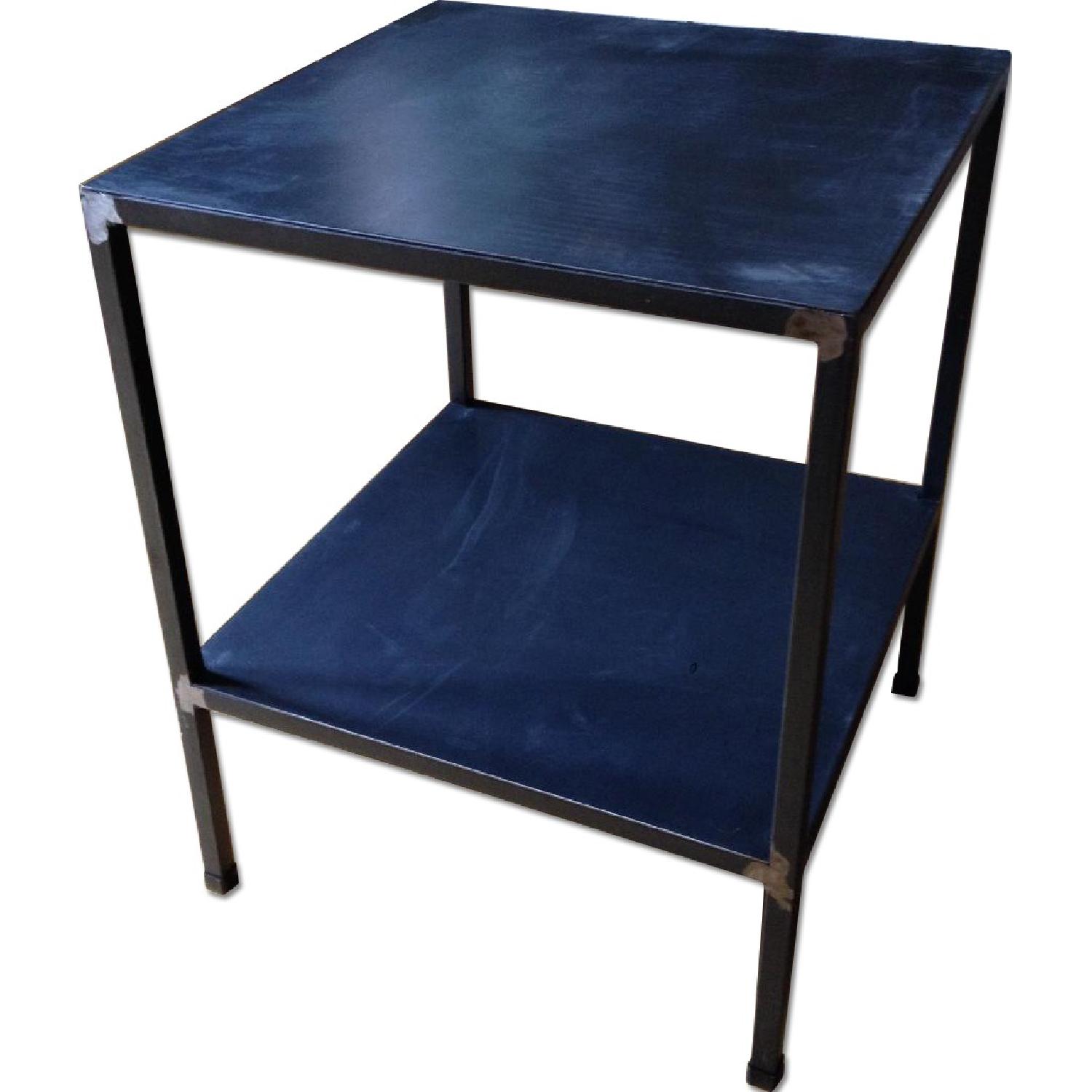 Seller's Notes:Three industrial steel end tables. Custom made and solid. They are not from retail shops which are copycat versions. Legs are 1/2" thick (rare). The tables are very well proportioned and designed with great simplicity. One table is in great condition, the second in very good condition with faint scratches; the third in good condition with some light and faint scratches which can be buffed out. As an idea you can purchase 16" square glass tops to protect them further. What I've done is cover the tops with a 20" square linen napkin and place a glass top over it. Classy! Another way to add warmth to it is to place a 15" square piece of finished wood to center on top making it very modern. Available to purchase singly at $80 each or all three for $240. Local pick-up only from Manhattan/Tribeca part of town. They'll easily fit in a cab's trunk and a back seat. 16"W x 16"L x 20 1/4"H. Bottom shelf at 7 1/4" high.