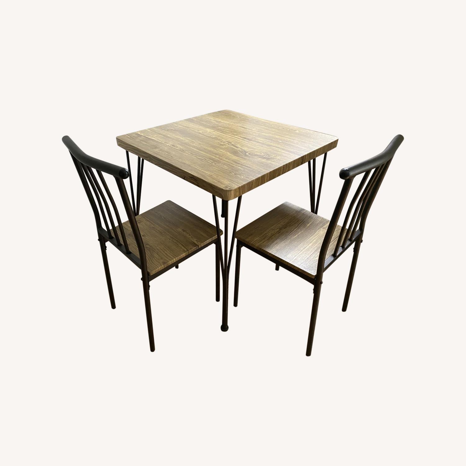 Seller's Notes:Wonderful space-saving 3-piece Industrial-style dining set in excellent condition. Durably built and beautifully finished with a thick tabletop and a sleek but sturdy steel frame, this set has a compact design perfect for small spaces. The two chairs slide under the table to save space and create an ideal tidy atmosphere. The set is incredibly versatile in style and function -- it can serve as a dining table, breakfast nook, or compact workspace. It's a wonderful set we regret parting ways with, but we're moving and need a larger set for entertaining guests.