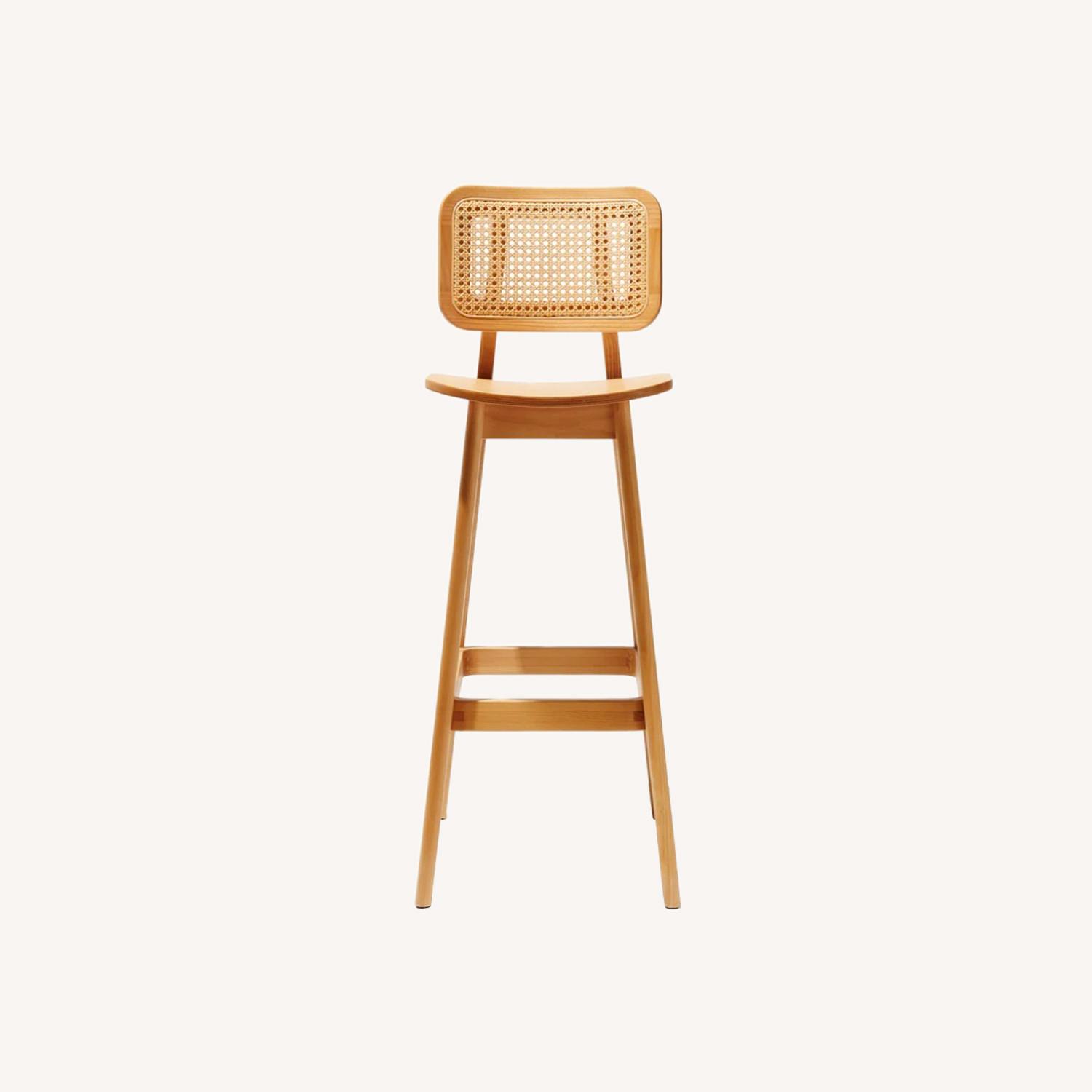 Seller's Notes:Beautiful 1 year old pair of bar stools, barely used. Beautiful natural wood and cane backs.