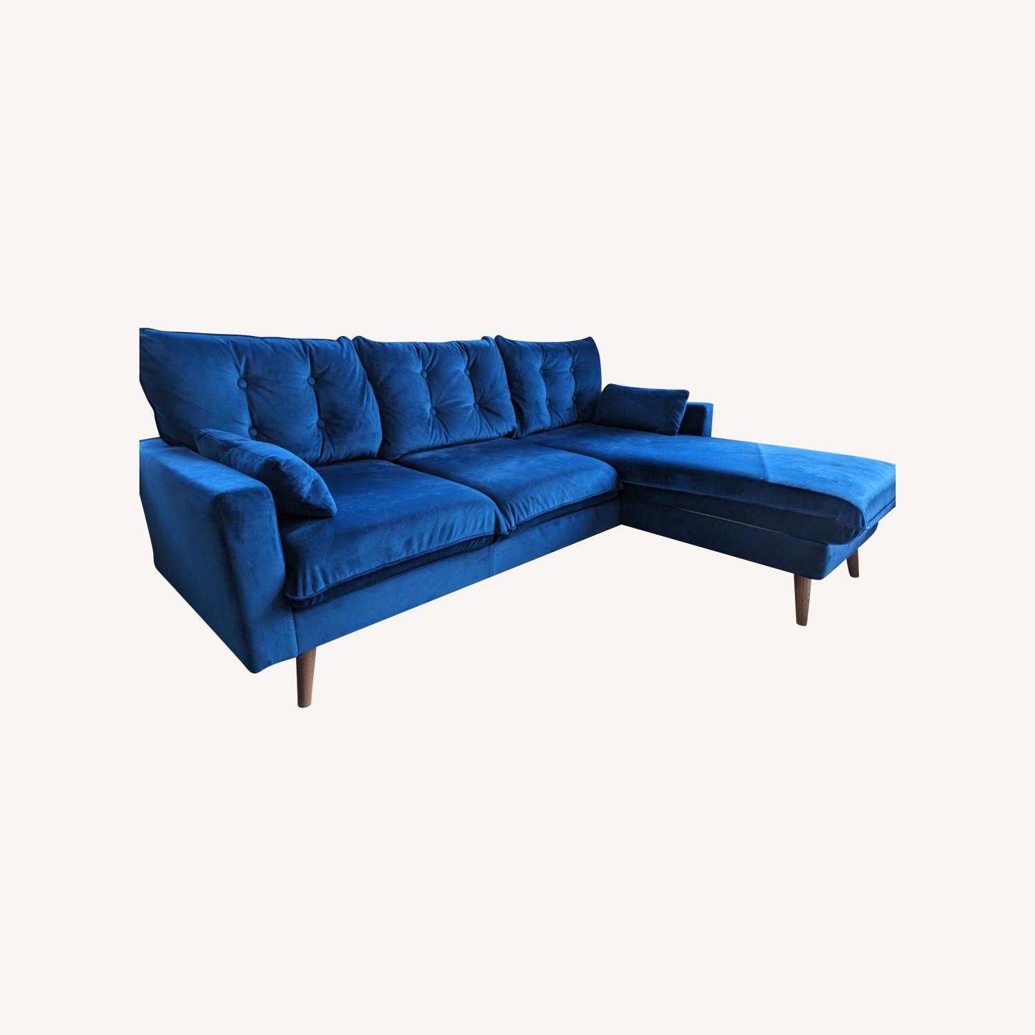 Seller's Notes:Selling our customized inside weather sectional sofa, luxury velvet upholstery in sapphire blue accent for the pop of color in your home with walnut brown legs. Plush comfort, well-maintained and in good condition. Used for less than 2 years with one minor stain. Selling only coz have to buy a bigger couch in the new home.