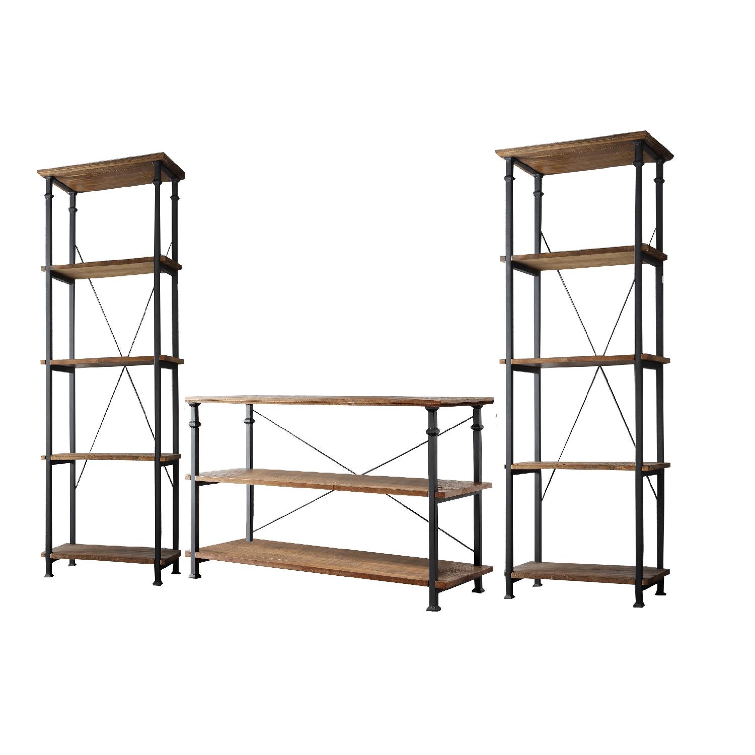 Seller's Notes:BRAND NEW Industrial Modern Rustic 3-piece Media Center. Relocating to LA - must sell all furniture (all new items, love everything, upset to even sell!) Wood tone is a perfect medium color and the metal frames are a soft black tone. This unit is perfect for the industrial look. The tv stand portions fits a 55” tv perfectly. Set includes one (1) TV stand, two (2) book cases Crafted of Poplar wood, metal Finish: Black sand metal Dimensions: Bookcase Dimensions: 74.5 inches high x 26 inches wide x 15 inches deep TV stand Dimensions: 30 inches high x 50 inches wide x 18 inches deep
