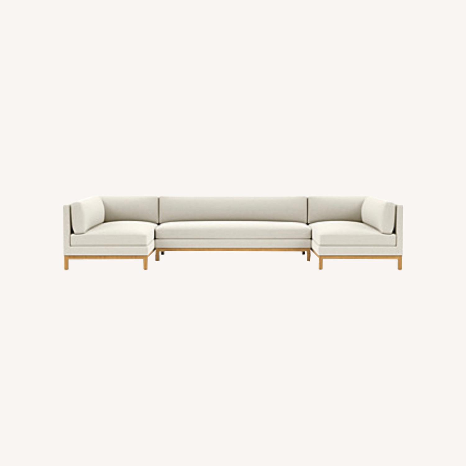 Seller's Notes:Like the perfect pair of relaxed-fit jeans, the Jasper sectional combines comfort and style. We consider it our ultimate lounging sectional. Clean lines, including a simple, solid wood rail, keep the overall design sleek with a hint of California-cool. The layered cushion is soft, yet supportive, and can be upgraded for an extra-soft sit and fully reversible cushion. With so many configuration options, the possibilities are endless. Upholstery color is chalk with oak legs.