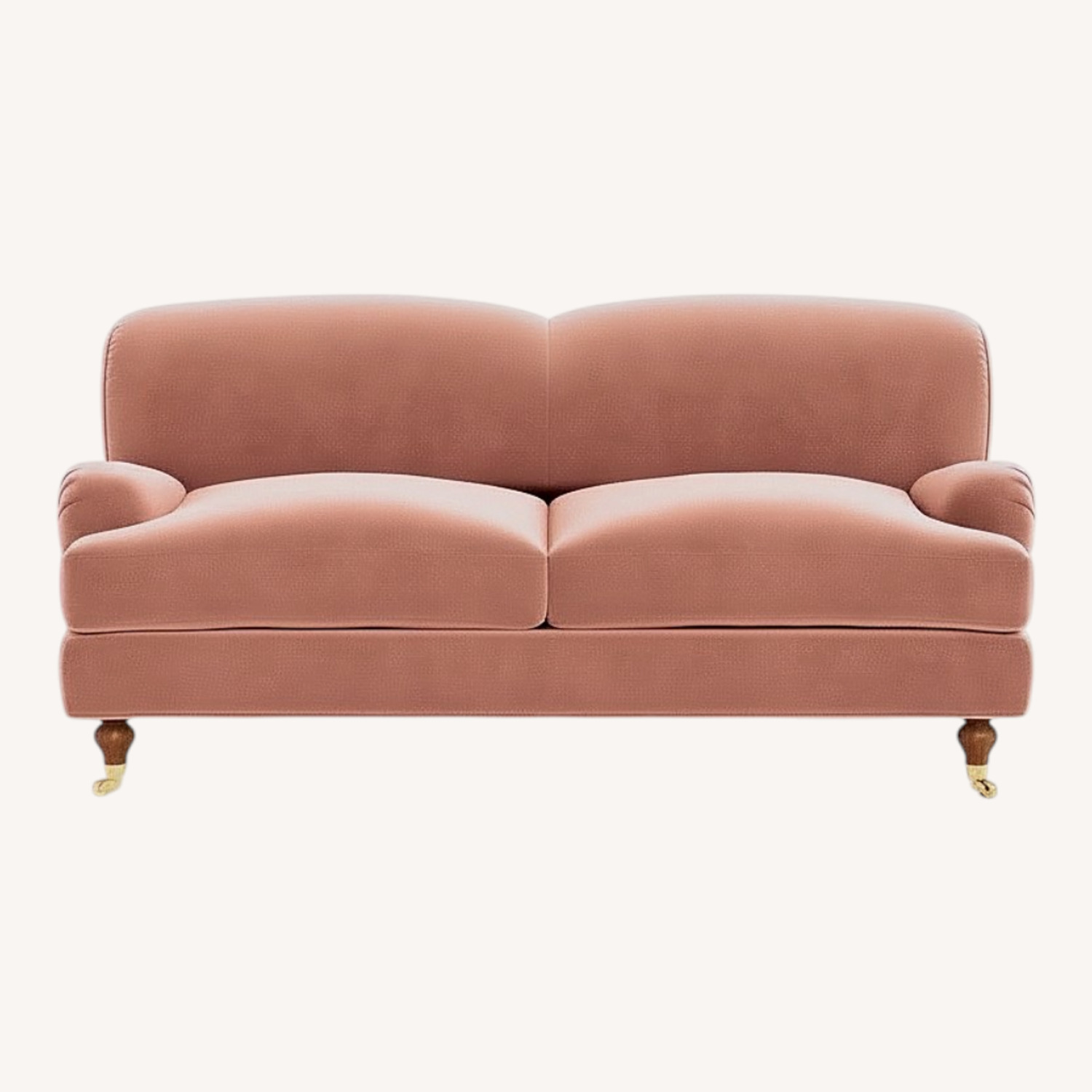 Seller's Notes:Custom made Interior Define Rose loveseat in Bloom. The fabric is plush performance velvet and the filling is a down/foam blend. It is really comfortable and well-made. I purchased this for my Primary Bedroom in 2021, and adore it. We are downsizing, so we don't have space to take it with us. It's in excellent condition and has been well taken care of. It's a true statement piece. It has a great energy about it!