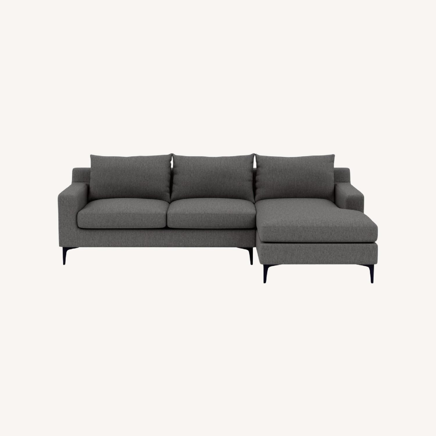 Seller's Notes:92” Interior define Sloan three-seater sofa with chaise in Charcoal fabric. Purchased in 2018 and well cared for in a clean, smoke-free, pet-free home. No damage or stains. Comfortable yet supportive cushions. Neutral color. Solid frame. Modern, mid-century profile.